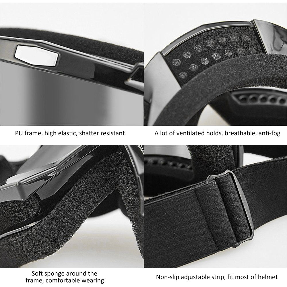 Q: What are the key features of the Dmeixs Motorcycle Goggles?A: The Dmeixs Motorcycle Goggles are designed with high-quality UP Resin material for excellent toughness and resilience. They feature scratch-resistant PC lenses that provide windproof, dustproof, shatter-proof, and 100% UV protection. Additionally, they have a non-slip, high elastic wide adjustable strap for a secure fit on any helmet, soft sponge padding for comfort, and a streamlined design for a broad, clear vision.