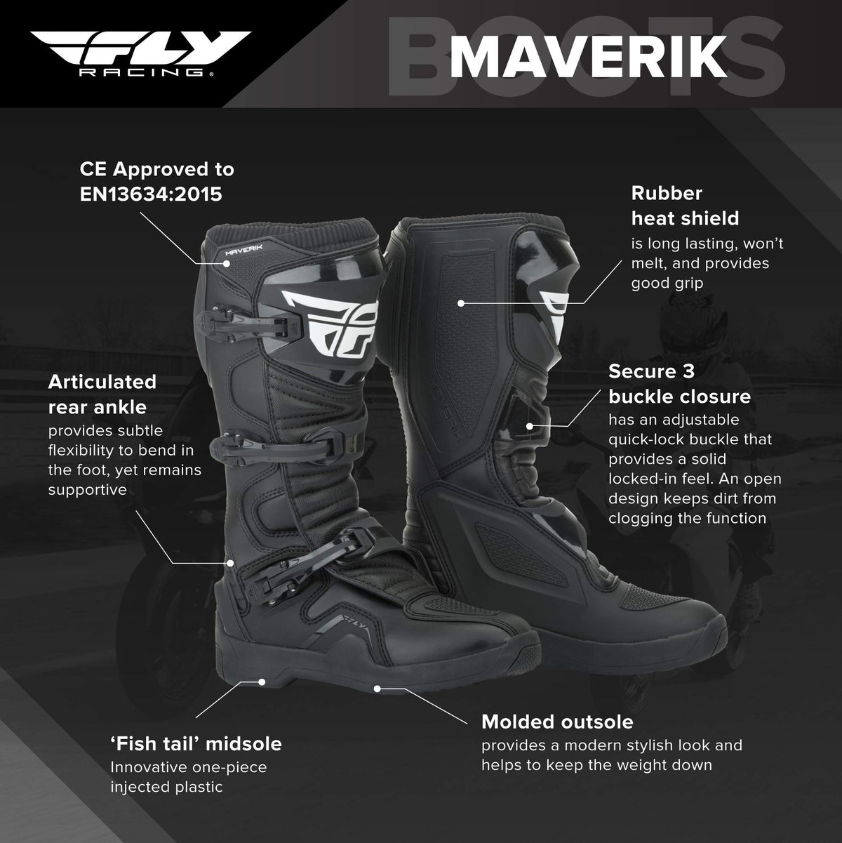 Q: What are the key features of the Fly Racing Adult Maverik Boot?A: The Fly Racing Adult Maverik Boot features CE-approved protection, a molded outsole for a lightweight design, an articulated rear ankle for flexibility, a 3D-molded plastic shift protection panel, and an elastic gaiter to keep debris out. Additionally, it has adjustable quick-lock buckles and a rubber heat shield for durability and grip.