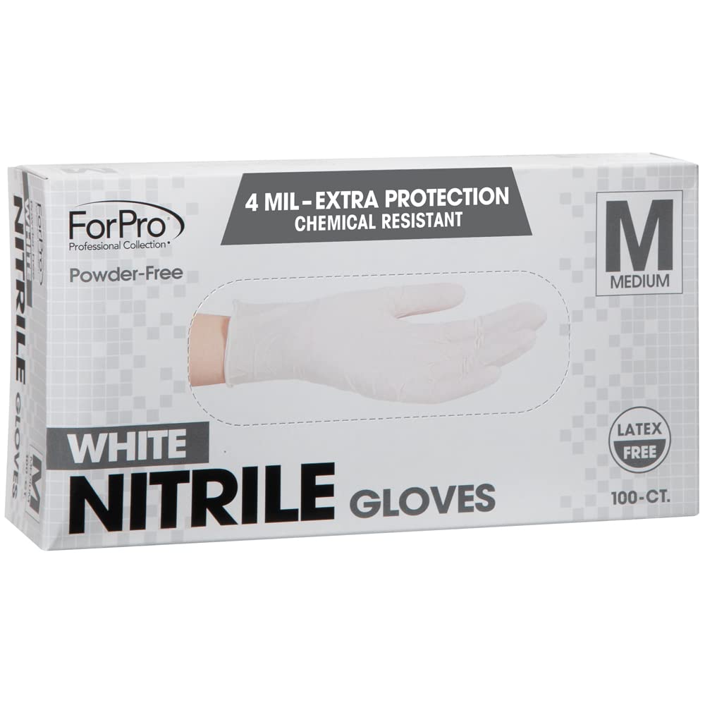 Nitrile Gloves: Chemical & puncture-resistant nitrile gloves provide a higher level of protection against liquids, gases, & sharp objects. The textured finish provides slip resistance in wet or dry conditions. Each glove features a beaded cuff and is 4 mil. thick. | Food Safe Gloves: Non-sterile and powder-free nitrile gloves can be used in restaurants, catering, concession stands, school cafeterias and at-home food preparation. | Latex-Free Gloves: Rubber and latex-free nitrile gloves are non-irritating and offer superior strength and comfort - perfect for people with sensitive skin and those who are prone to allergic reactions. | Disposable Gloves: Ambidextrous and disposable nitrile gloves for single use only. Come in a convenient dispenser box. | Size: Medium, Color: White, Thickness: 4 mil, Count: 100