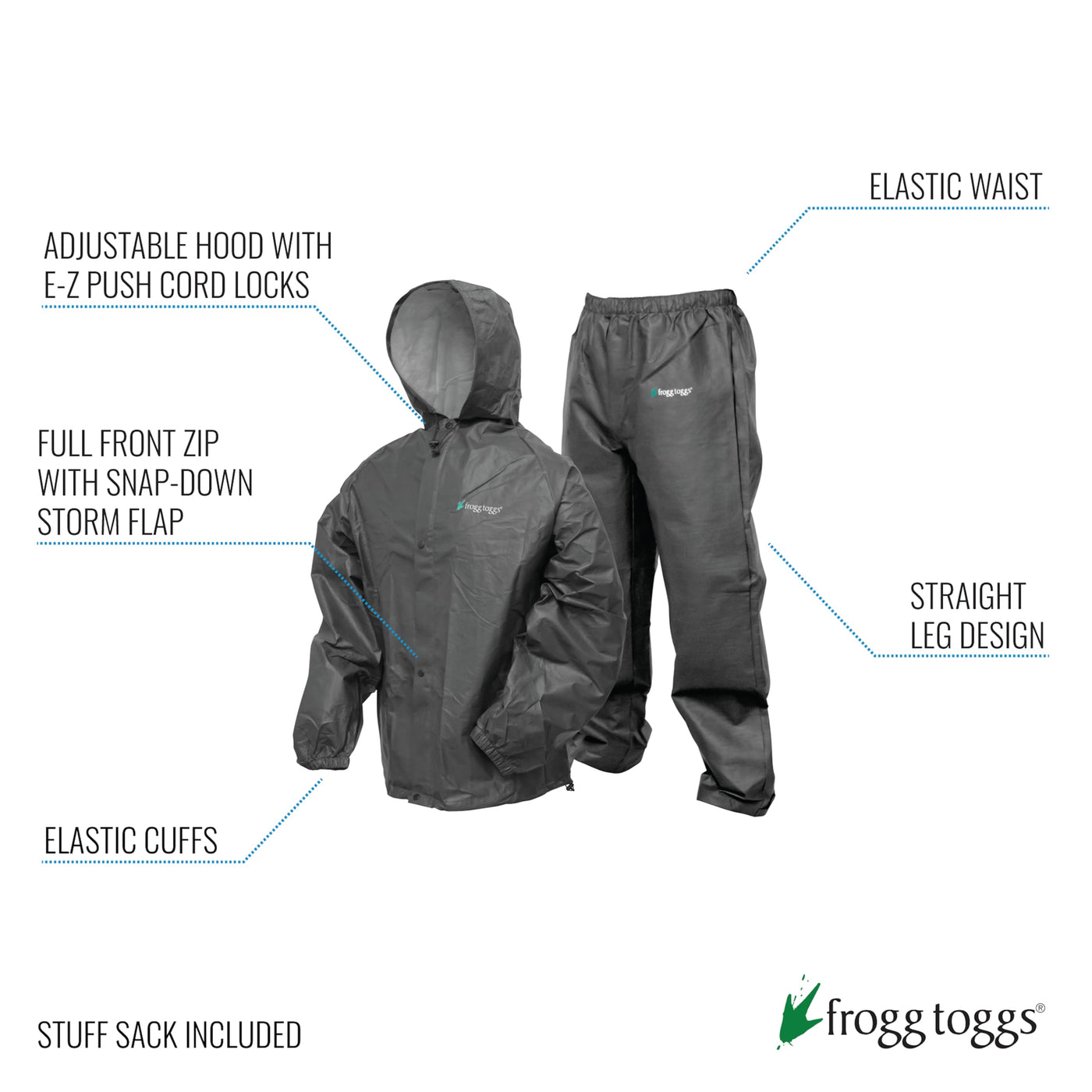 With A Free Stuff Sack Included The Pro-Lite Is The Best And Most Durable Value For Your Rainwear Needs.Pl12140Frogg Toggs Pro-Lite Rain Suit- Waterproof & Breathable- Made From Frogg Toggs L83 Nonwoven Bi-Laminate Materials- Includes Stuff Sack- Washable And Recyclable Materials- No Pvc Or Phthalates- Fully Adjustable Hood- Zippered Front Closure With Storm Flap- Elastic Waist Jacket And Pantmen'S Sizes: S/M, M/L, And Xl/2Xlsold As A Suit.