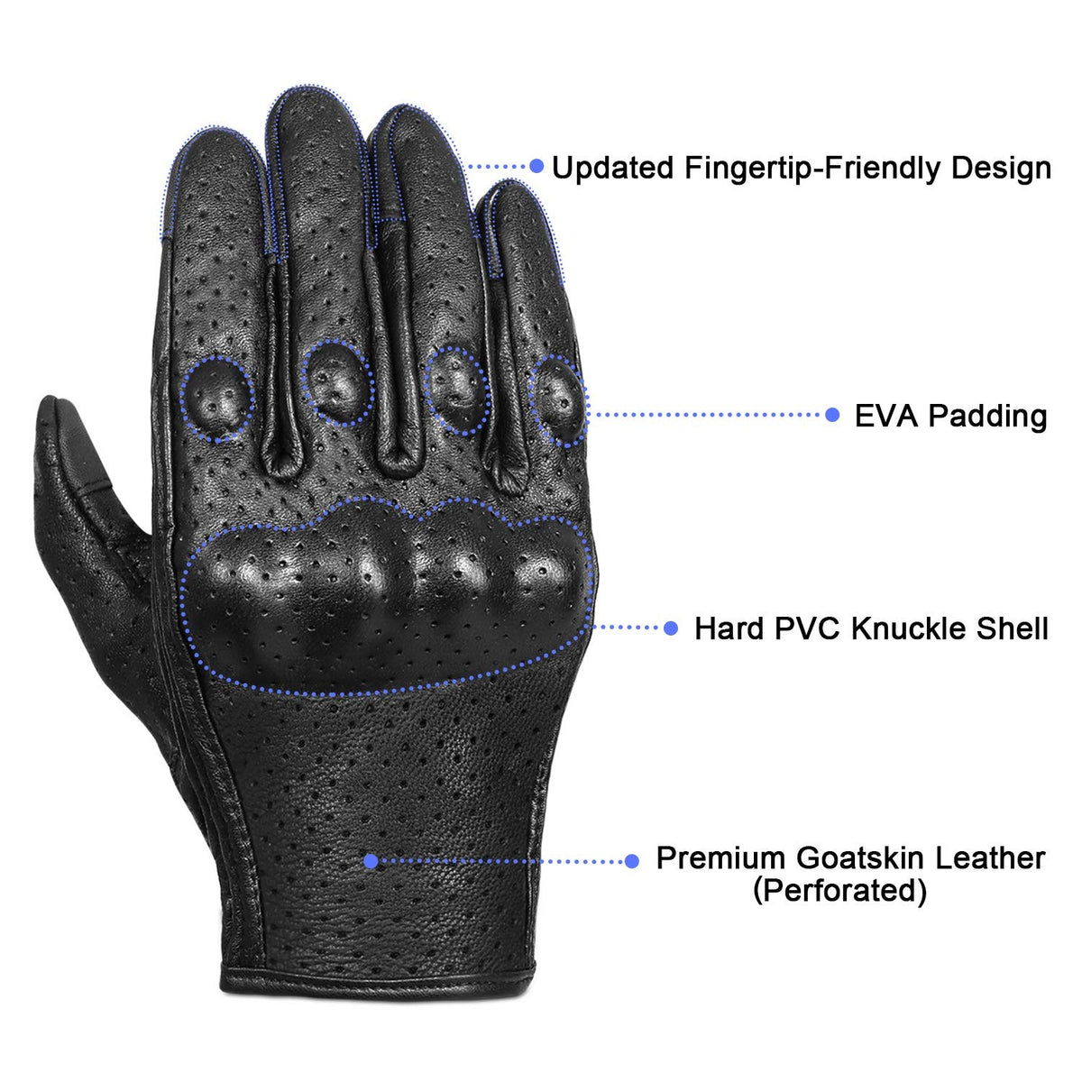 Q: What material are the gloves made of, and how durable are they?A: The gloves are made of genuine goatskin leather, which is soft, flexible, lightweight, and known for its durability and long life. The material provides excellent protection while ensuring comfort during rides.