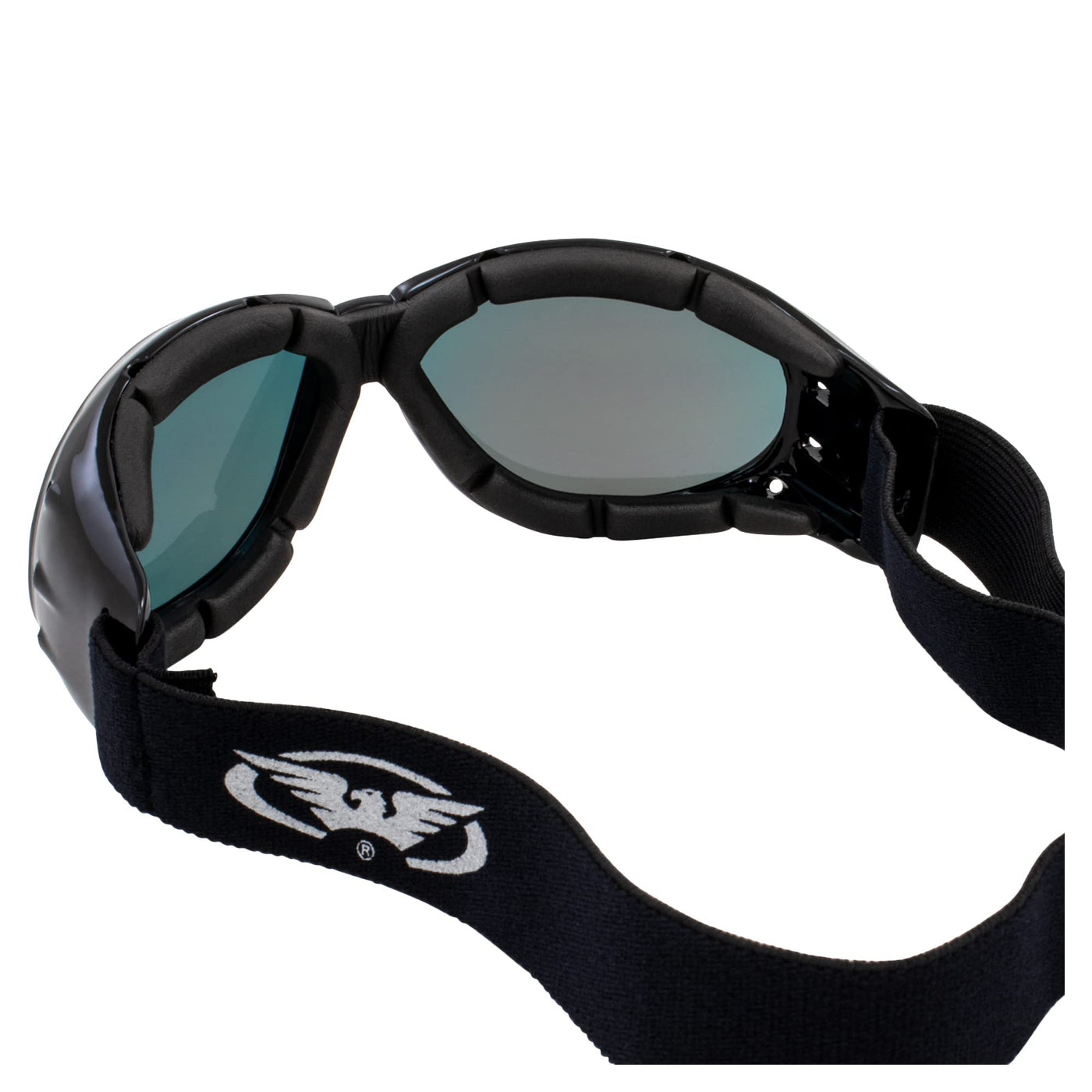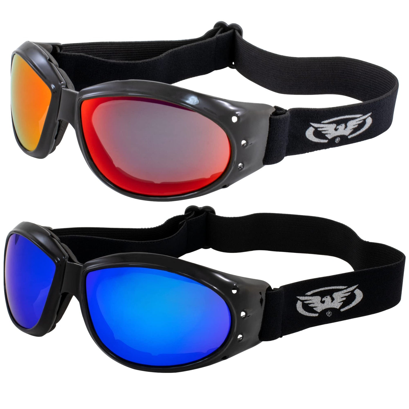 Two (2) Red Baron Style Motorcycle Goggles. You will Receive One Pair with Red Mirror Lenses and One with Blue Mirror Lenses. Each Pair Comes With a Carry Pouch. Our Eliminator Goggle is equipped with soft airy foam padding for a comfort fit during your long rides. The high quality lenses provide maximum protection from the elements, and the UV400 shatterproof lenses eliminate the harmful rays of the sun. Mirror lenses are constructed by applying a reflective coating to a smoke lens base. These unique products deliver the same protection as smoke lenses but have the added benefits of enhanced color perception while reducing glare -- all due to the addition of the color reflective coating. Ideal for full-sunlight, snow, and water-reflective conditions. Light transmission 10-13% depending on reflective coating applied.