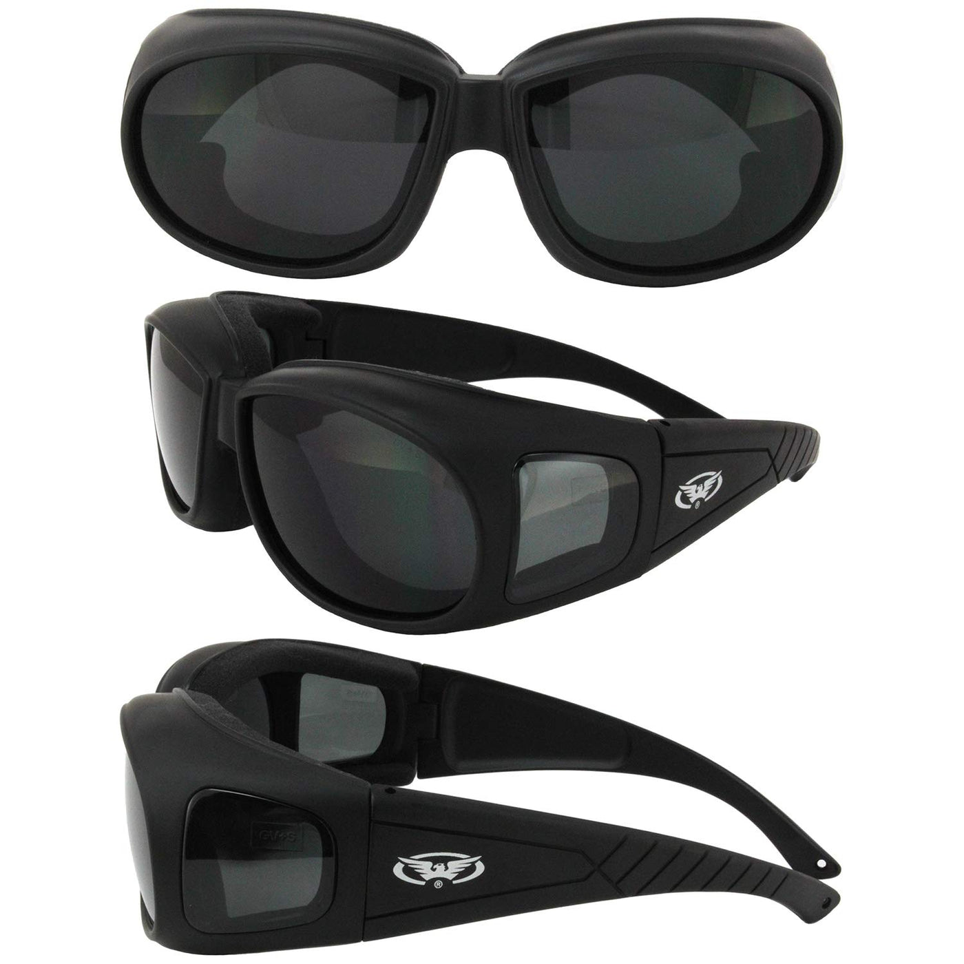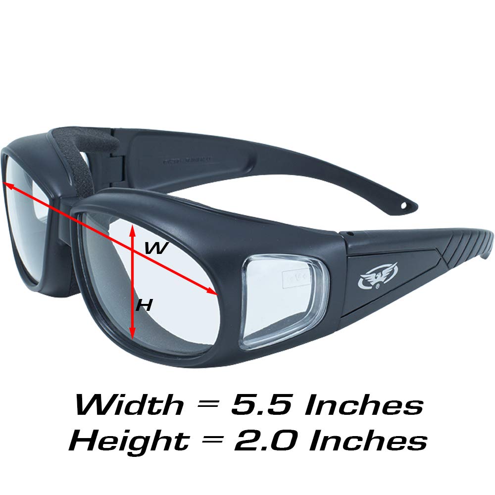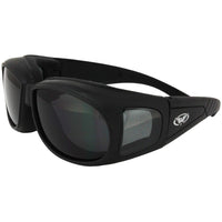 DescriptionFor a great option to keep the grit out of your eyes while still wearing your regular glasses, look no further! These sturdy Global Vision Outfitter Over The Glasses motorcycle safety glasses fit comfortably over most frames. A convenient little side window allows for protected peripheral vision. The air-soft foam padding provides ultimate comfort and maximum wind, dust, and debris protection while anti-fog technology ensures a clear line of sight. Forget about swapping your regular glasses out for expensive motorcycle glasses. Don't worry about drying your eyes out with uncomfortable contacts. Just secure these babies over your own glasses and enjoy the ride. This set includes clear lenses for day safe and protected night riding. The soft airy foam seals out the wind and keeps the sweat out of your eyes on hot days. And we dare you to try and destroy the black nylon frames! One customer said she stepped on them twice without a scratch! Simply slip on these safety shades over your regular glasses and hit the road. We promise you'll enjoy the ride.