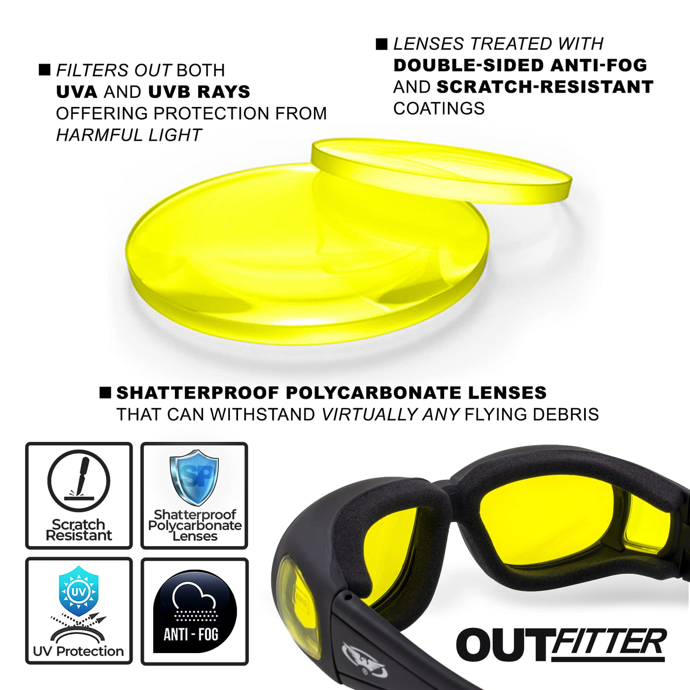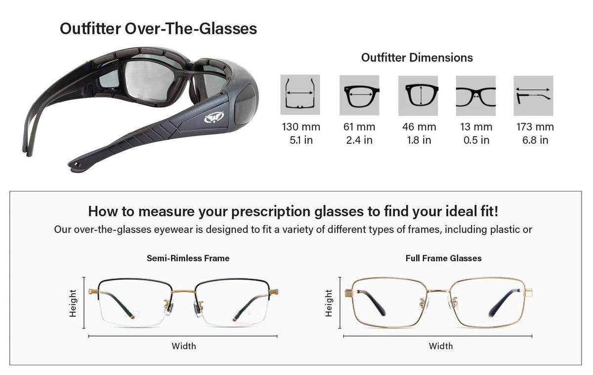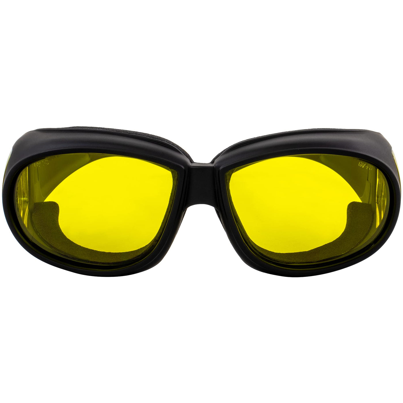 For a night option to keep the grit out of your eyes while still wearing your glasses, look no further! These sturdy Global Vision Outfitter Over The Glasses Anti-Fog motorcycle safety glasses fit comfortably over most frames. A convenient little side window allows for protected peripheral vision. The air-soft foam padding provides ultimate comfort and maximum wind, dust, and debris protection. Forget about swapping your regular glasses out for expensive motorcycle glasses. Don't worry about drying your eyes out with uncomfortable contacts. Just secure these babies over your own glasses and enjoy the ride. Anti-fog coating ensures you'll have a clear line of sight no matter what. The soft airy foam seals out the wind and keeps the sweat out of your eyes on hot days. And we dare you to try and destroy the matte black nylon frames! One customer said she stepped on them twice without a scratch! Simply slip on these safety shades over your regular glasses and hit the road. We promise you'll enjoy the ride.
