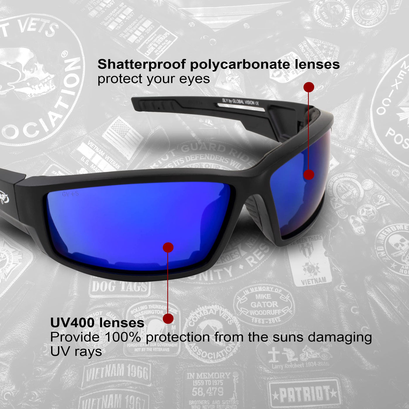 Q: What are the benefits of using Global Vision Sly Padded Motorcycle Sunglasses?A: The Global Vision Sly Padded Motorcycle Sunglasses offer a combination of comfort and protection for riders. With UV400 lenses, they provide 100% protection from harmful UV rays, while the shatterproof polycarbonate ensures safety in various conditions. The unique aerodynamic design allows for a universal fit, making them suitable for both men and women.