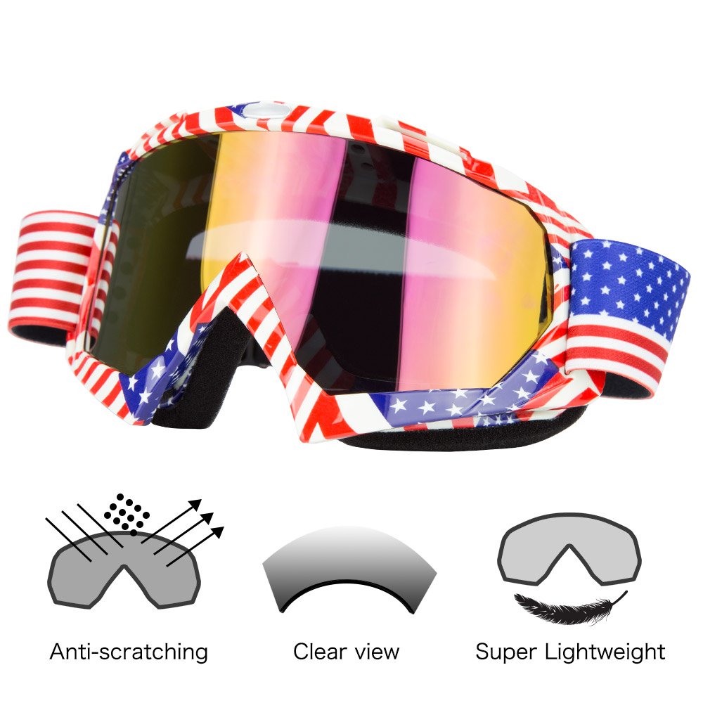 Q: Do the goggles come with interchangeable lenses or additional features?A: The JAMIEWIN goggles feature a flag frame and color lens design, but they do not include interchangeable lenses. They are designed for style and functional performance during rides.