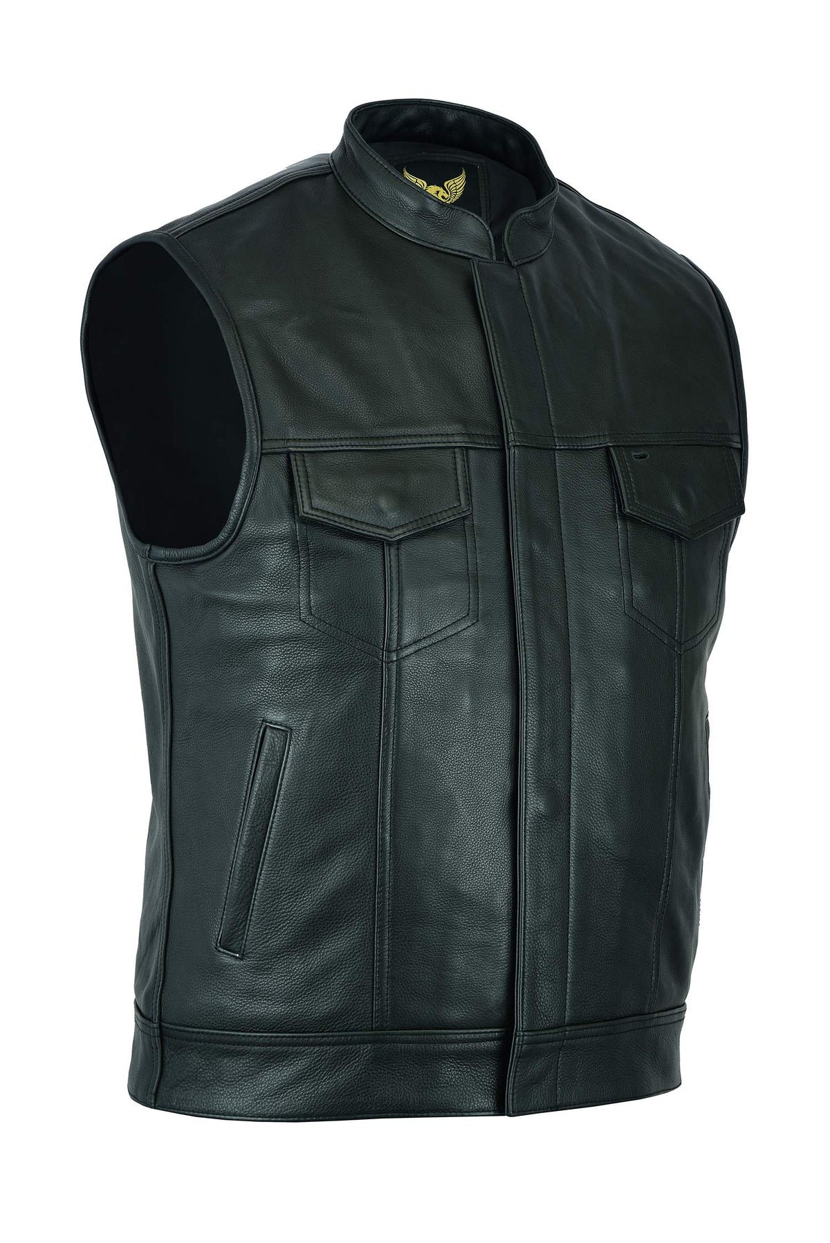 Leatherick Mens Black Motorcycle Vests - Soa Club & Traditional Paisley Satin Liner Leather Biker Vests (Us, Alpha, Small, Regular, Regular, Black (With Collar))