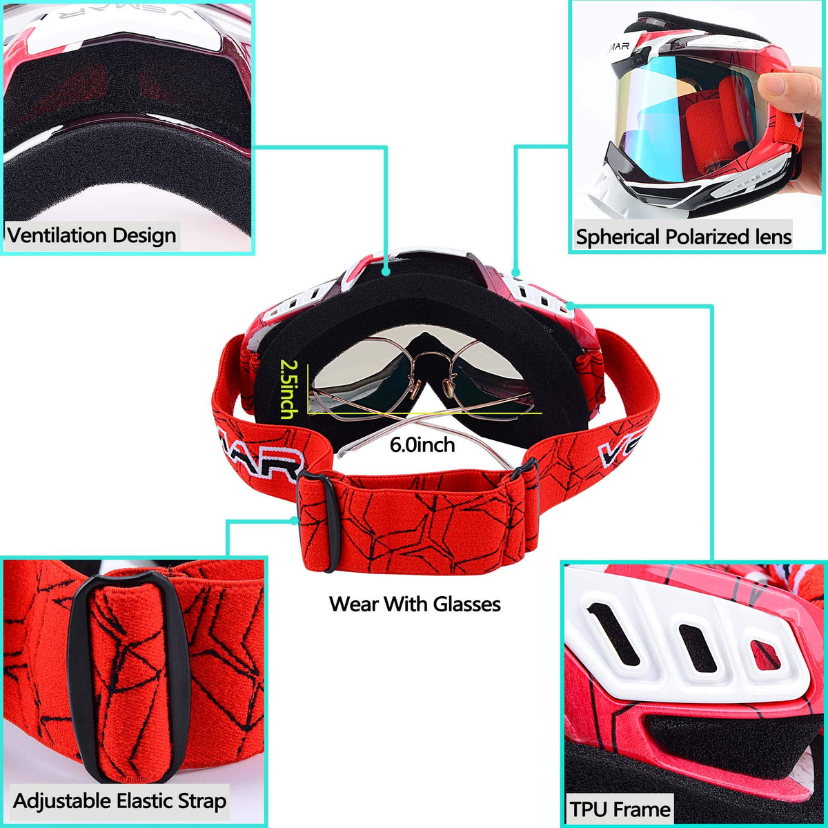 Q: What activities are these motorcycle goggles suitable for?A: These motorcycle goggles are designed for a variety of outdoor activities including dirt biking, ATV riding, motocross racing, skiing, snowboarding, and other extreme sports. They provide excellent protection and visibility in various conditions.
