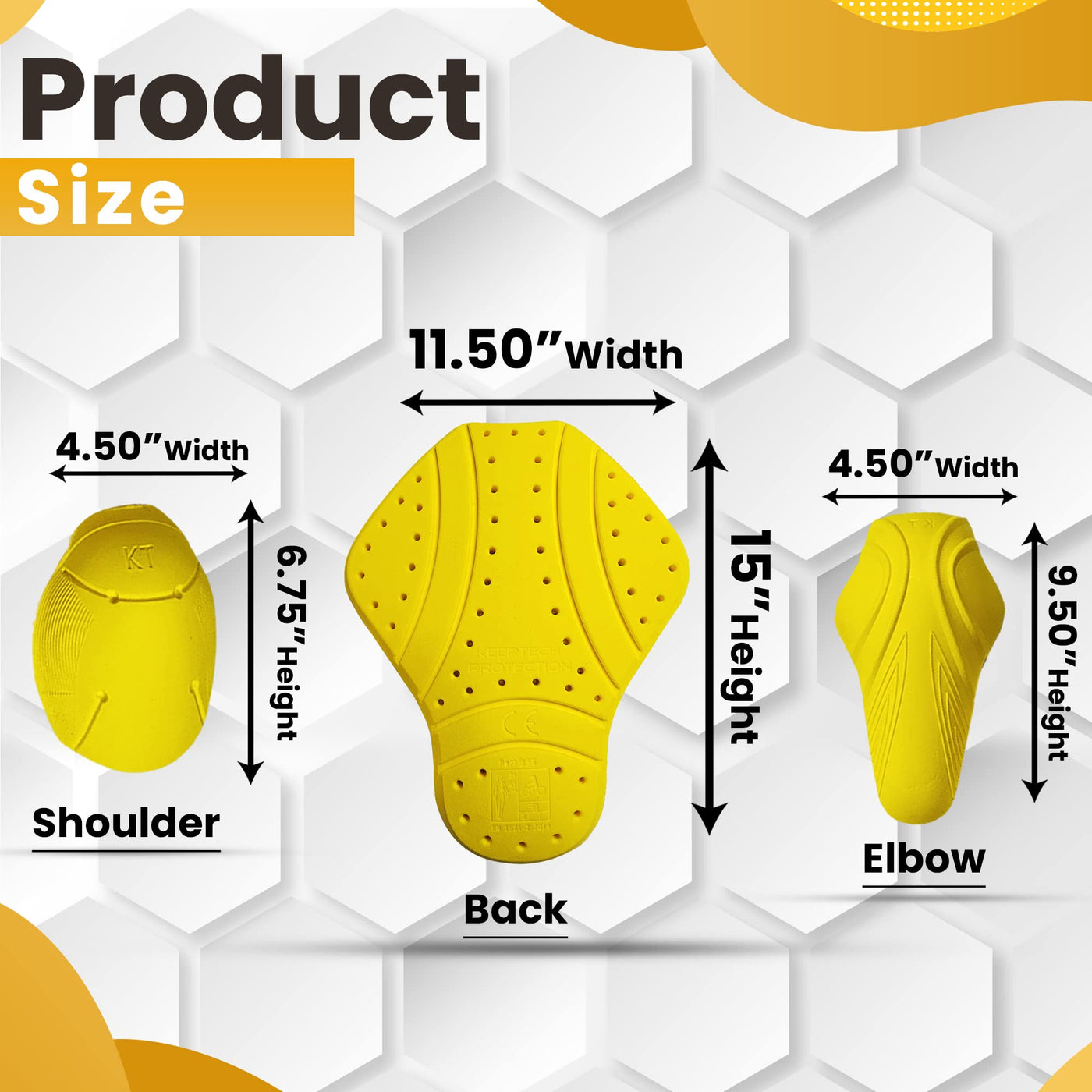 Product Detail: : Color: - YellowUtilization of CE Insert Armor may be an effective preventive measure for back, shoulder, and elbow injuries including spinal cord injuries in motorcyclists. Through their shock absorptive and abrasion-resistant qualities, back protectors are intended to protect the tissues of the back, shoulder blades, ribs, and spine. Back protector is additional protection that is installed in the motorcycle jacket and which protects our spine against impacts in the event of a fall. This back protector can be more or less soft according to the material chosen.Product Features: :Rated one of the top bike safety gear of 2021. A truly beautiful keep-their-attention safety gear. Best wind cooling frame. Frame made of high-quality polyester fiber. Flexible. 3-Free, fully safety tested, hand washable. Specification: Material: :polyester fiberWeight: : 0.81 poundCustomer satisfaction: :Complete customer satisfaction is our top priority, so we work in close contact with our clients throughout the procedure. We are offering a money-back guarantee for customers that are not 100% satisfied. If for any reason you are not satisfied - just contact us and you will get a full refund!