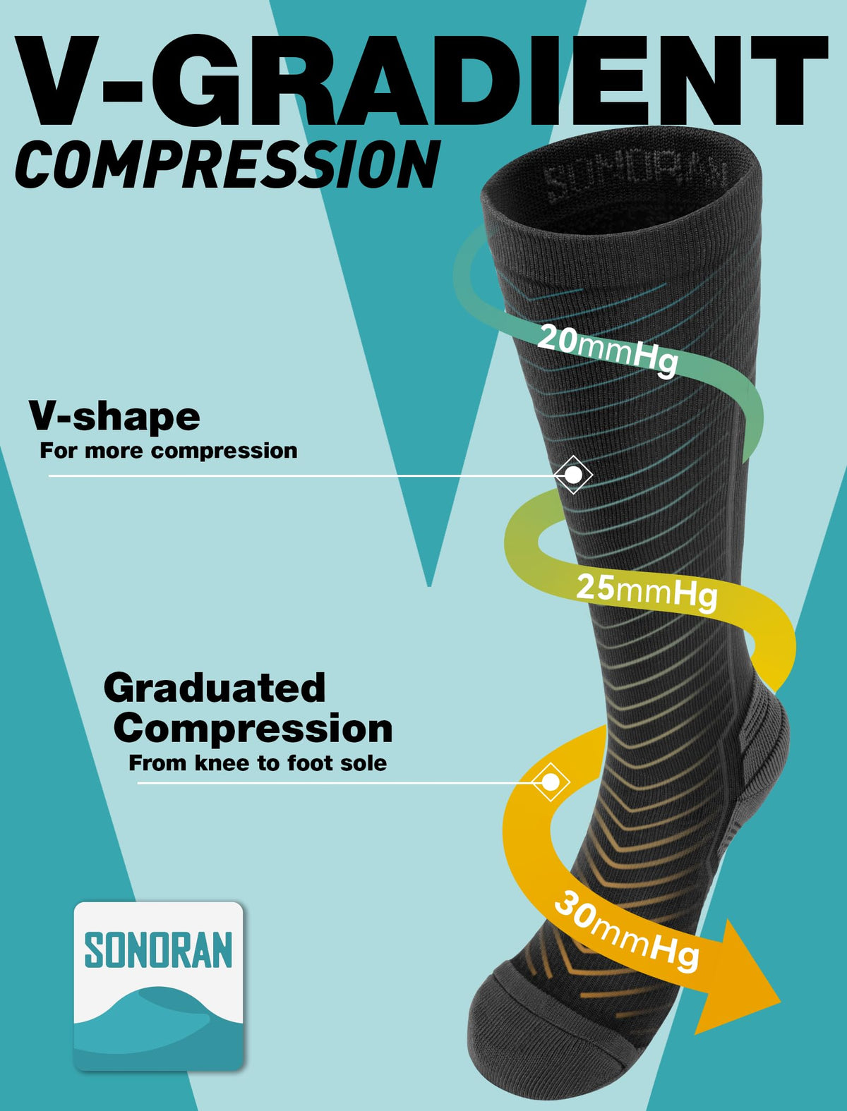 Q: What is the compression level of SONORAN Compression Socks?A: The SONORAN Compression Socks provide a graduated compression level of 20-30 mmHg, designed to promote optimal blood circulation and reduce leg swelling.