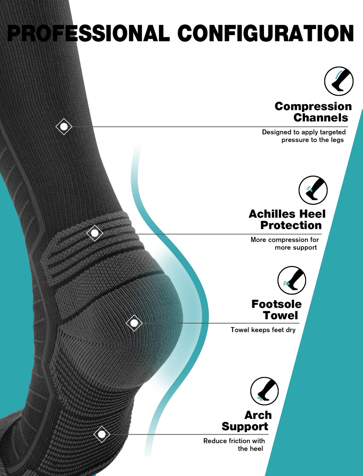 Q: How do these compression socks help prevent muscle cramps?A: These socks feature the CrampRelief GastroSupport Compression System, which applies targeted pressure on the calf to reduce muscle vibration and minimize the risk of cramping during high-intensity activities.