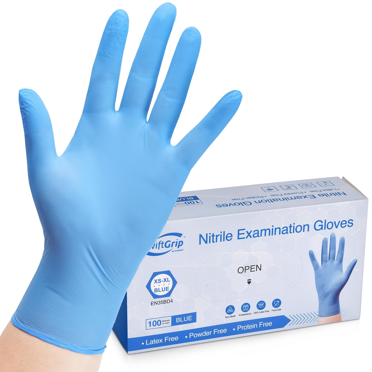 Q: What sizes are available for SwiftGrip nitrile gloves?A: SwiftGrip nitrile gloves are available in various sizes including XS, small, medium, large, and XL. Each size is packaged in color-coded boxes for easy identification, allowing you to choose the perfect fit for your needs.