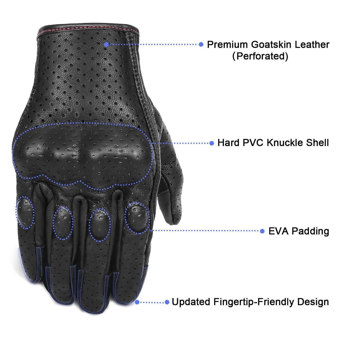 Q: What material are these motorcycle gloves made of?A: These gloves are made from genuine goatskin leather, which is soft, flexible, and durable. The perforated design also enhances breathability, making them suitable for spring, summer, autumn, and early winter riding.