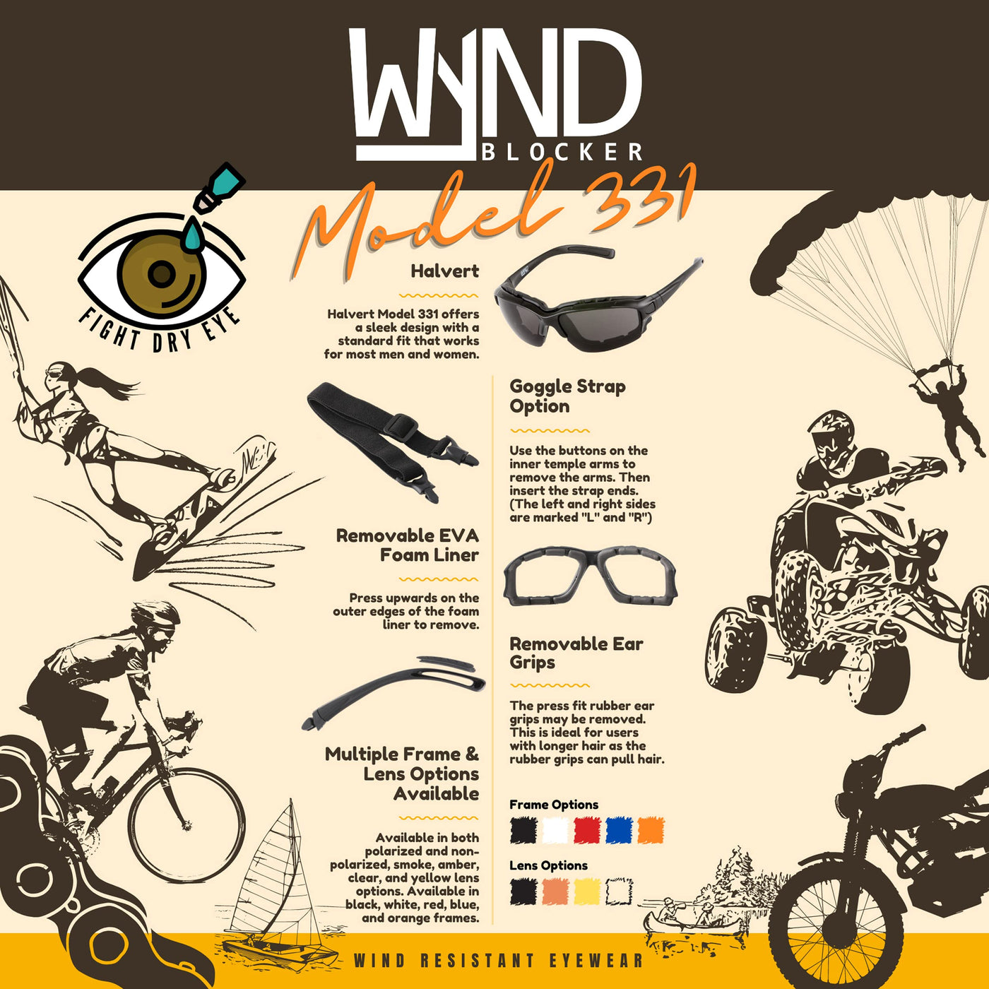 Wynd Blocker Model 331 Features A Quick Release Button Allowing Easy Transformation From Glasses To Goggles And A Removable Foam Wind Blocking Liner While Similar In Functionality To The Wynd Blocker Model 328, They Feature Different Front Face Design They Also Feature Removable Rubber Ear Pieces The Ear Pieces Provide Extra Grip, But Some Users Dont Like How They Can Catch On Their Hair So The Option To Remove These Pieces Is Ideal For Some Users They Are Currently Available In Black, Blue, Red, Orange, And White Frames With Various Lens Options