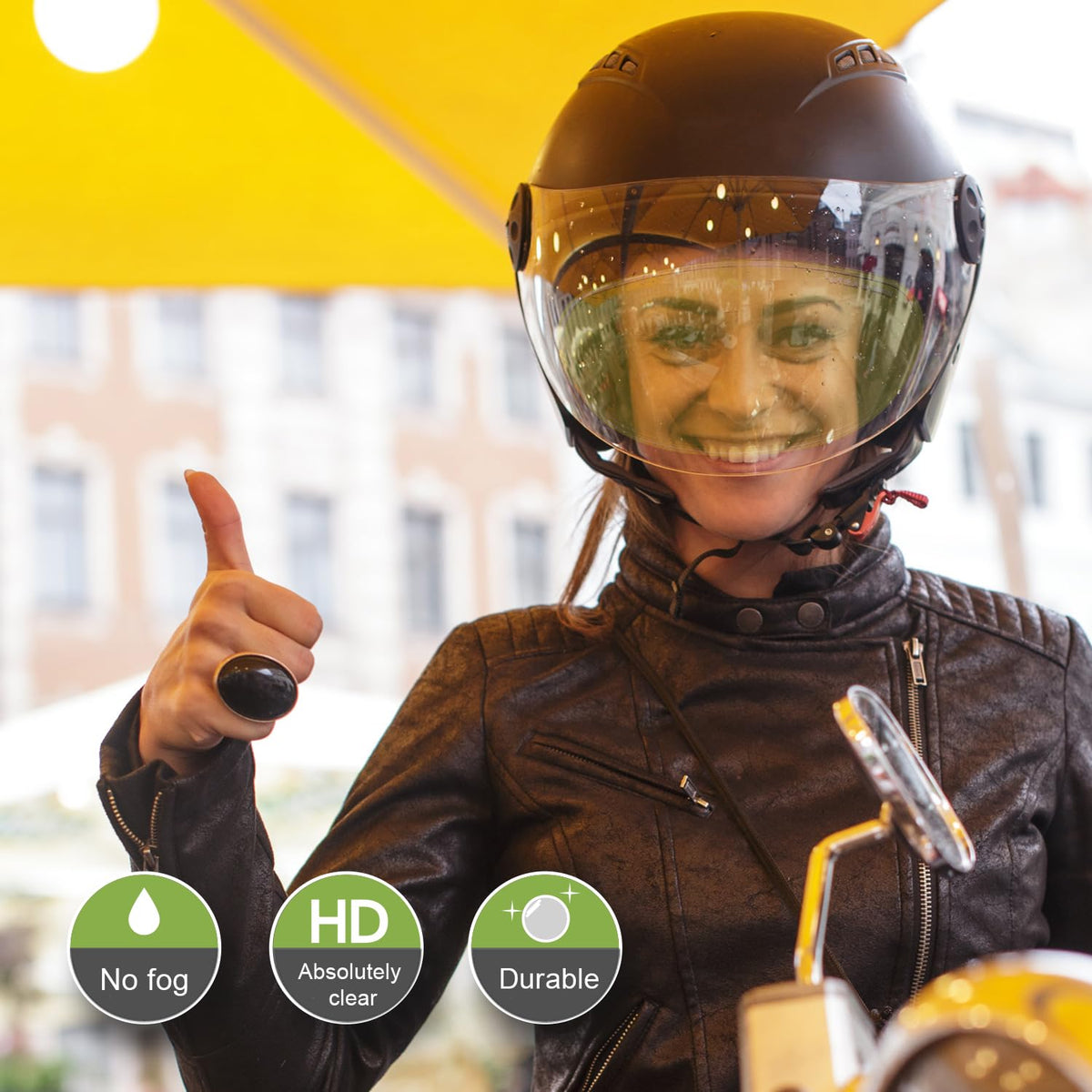 Q: What benefits does the yellow visor lens offer for night driving?A: The yellow visor lens enhances contrast and helps quickly spot moving objects at night, while also blocking an additional 30% of blue light, making it suitable for safer nocturnal riding.