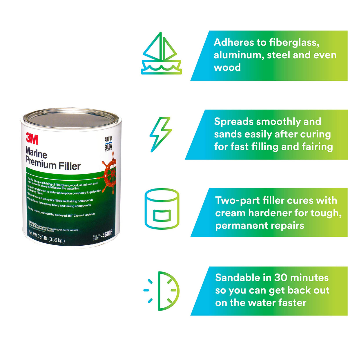 3M Marine Premium Filler Is Designed Specifically For Marine Filling And Fairing Jobs Including Boat Fiberglass Repair, As Well As Minor Repairs To Recreational Vehicles. It Features A Tough Vinyl Ester Formula That Is Very Resistant To Water Absorption, Excellent For Long-Term Performance Above And Below The Waterline. It Spreads Smoothly For Fast, Clean Filling Of Minor Holes And Gaps In Fiberglass, As Well As Wood, Aluminum And Steel. The Two-Part Filler Cures Fast With The Included 3M Marine Cream Hardener- It Becomes Sandable In 30 Minutes -And Easily Sands To A Smooth Finish For Efficient Fairing And Filling, So You Can Get Back Out On The Water Or The Road. 3M Marine Premium Filler Is Also Great For Achieving A Smooth, Sandable Surface Over Reinforced Fillers Such As 3M Marine High Strength Repair Filler.