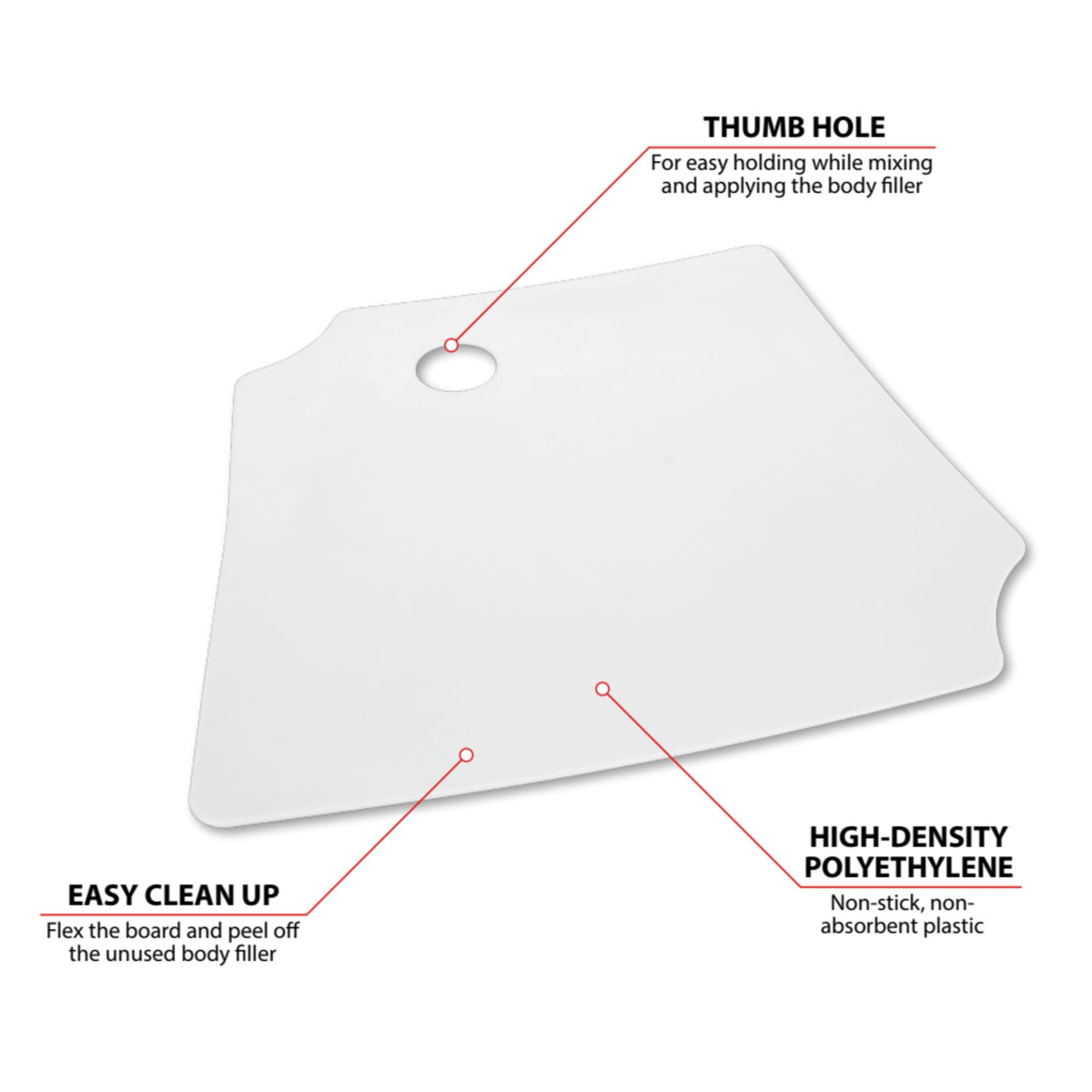 Q: Does the mixing board have any features that enhance usability?A: Yes, it features a thumb hole that provides a secure grip while mixing and applying fillers, enhancing overall usability and control during the process.