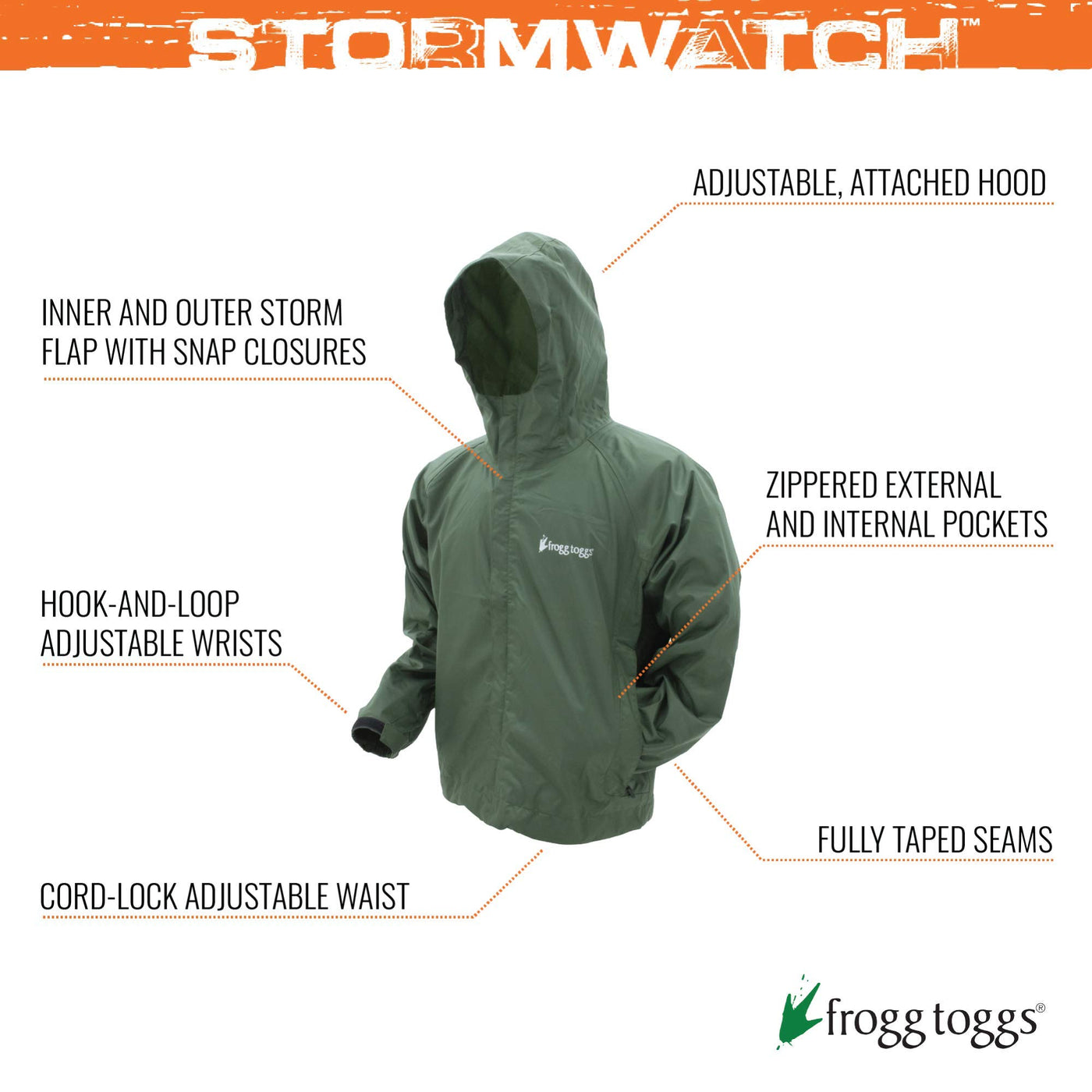 WATERPROOF - Made with frogg toggs breathable, non-woven, seam taped fabric that is waterproof, wind resistant, and extremely lightweight. Perfect for light use when reliable waterproof protection is necessary | AFFORDABLE PROTECTION - made with waterproof nylon and DRIPORE Gen 2 fabric, the Stormwatch provides excellent, affordable, durable, and reliable rainwear | FEATURES - Jacket features an adjustable hood with cord locks, inner and outer storm flap with snap closures, zippered external and internal pockets, adjustable wrist cuffs, cord-lock adjustable waist and fully taped seams | USES - The Stormwatch Jacket provides 8,000mm waterproof breathable protection making it an excellent choice for a full day in the rain. Perfect for fishing, boating or other wet weather activities | SINCE 1996 - frogg toggs has endeavored to provide the world