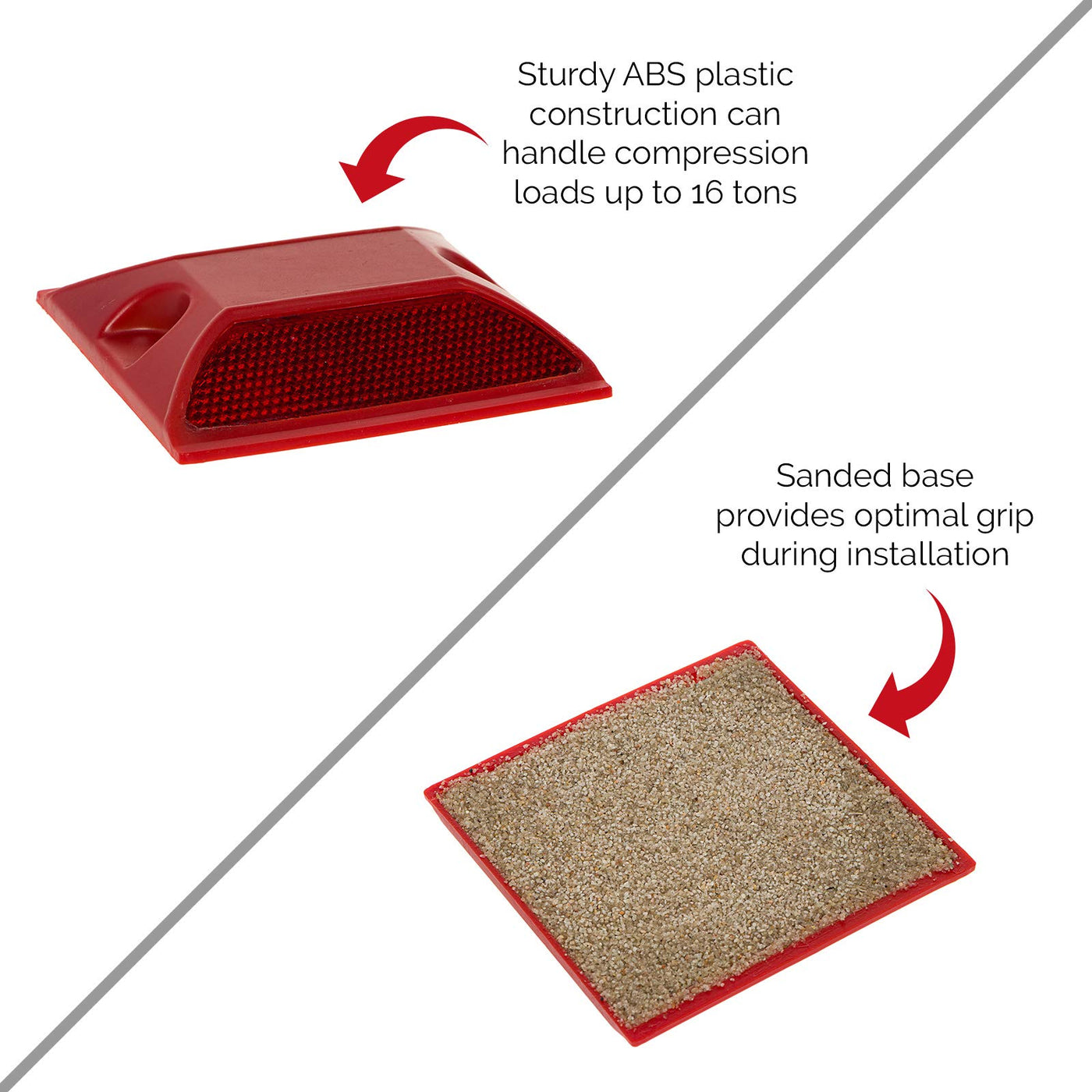This multi of Commercial Reflective Road Markers by Reusable Revolution is your go to solution for improperly marked roads or driveways. When you're travelling at night on a dark road the pavement seems to get lost. Placing these road studs on the edges and center of the pavement can clearly mark where lanes begin and end. A sanded wide base provides a large surface area to apply adhesive to during installation and prevents sinking during the summer. Its Durable ABS plastic construction can handle loads up to 16 tons with ease making them ideal for busy highways. Quickly mark your road, parking lot, or driveway with this value pack of 10 roadside markers. Each stud measures 4'' x 4'' x 0.75''.