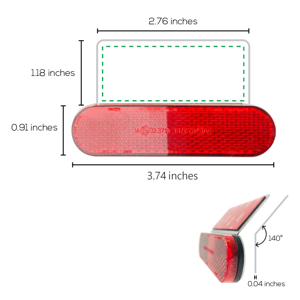 Q: What are the dimensions of the reflector and mount?A: The reflector measures 3.66 × 0.91 inches, while the stainless steel mount has dimensions of 2.08 × 3.66 × 0.04 inches. This compact size allows for easy integration with your motorcycle without being obtrusive.