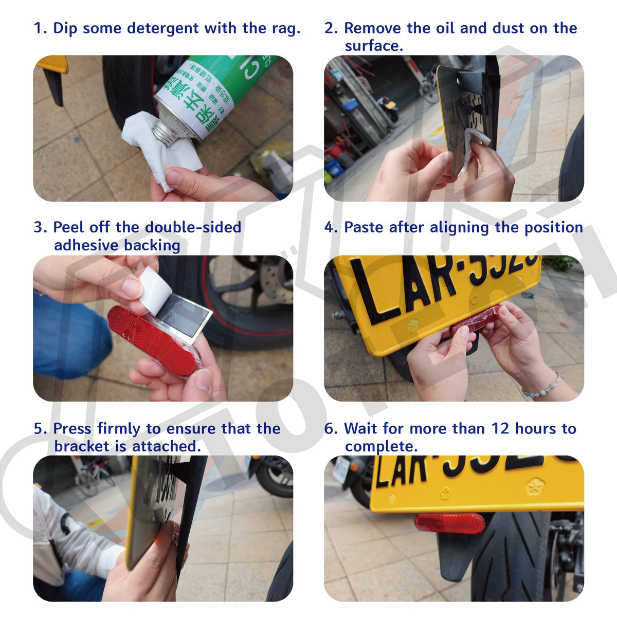 Q: How do I install the stick-on reflector mount?A: Installation is simple and requires no tools. The reflector uses 3M VHB double-sided tape, which has a strong adhesive and excellent heat resistance. Just clean the surface, peel off the backing, and stick it onto your motorcycle. This method avoids any damage to your license plate.