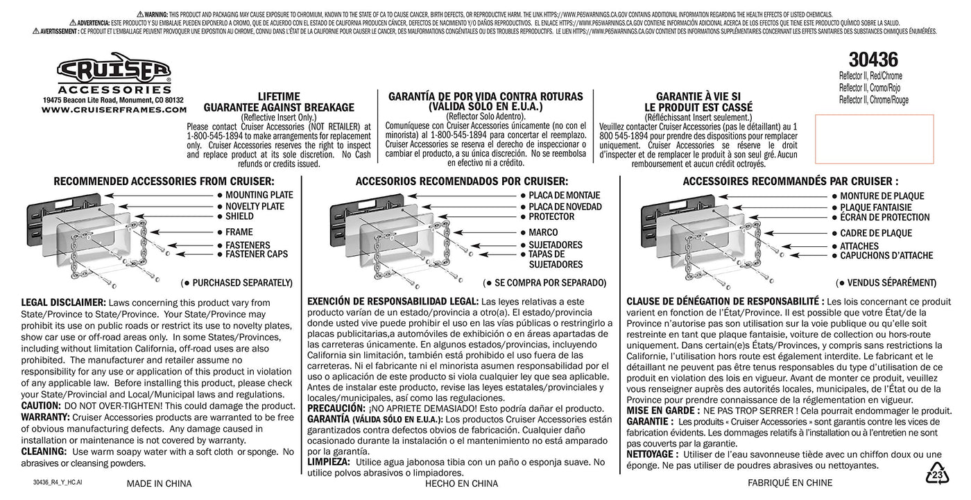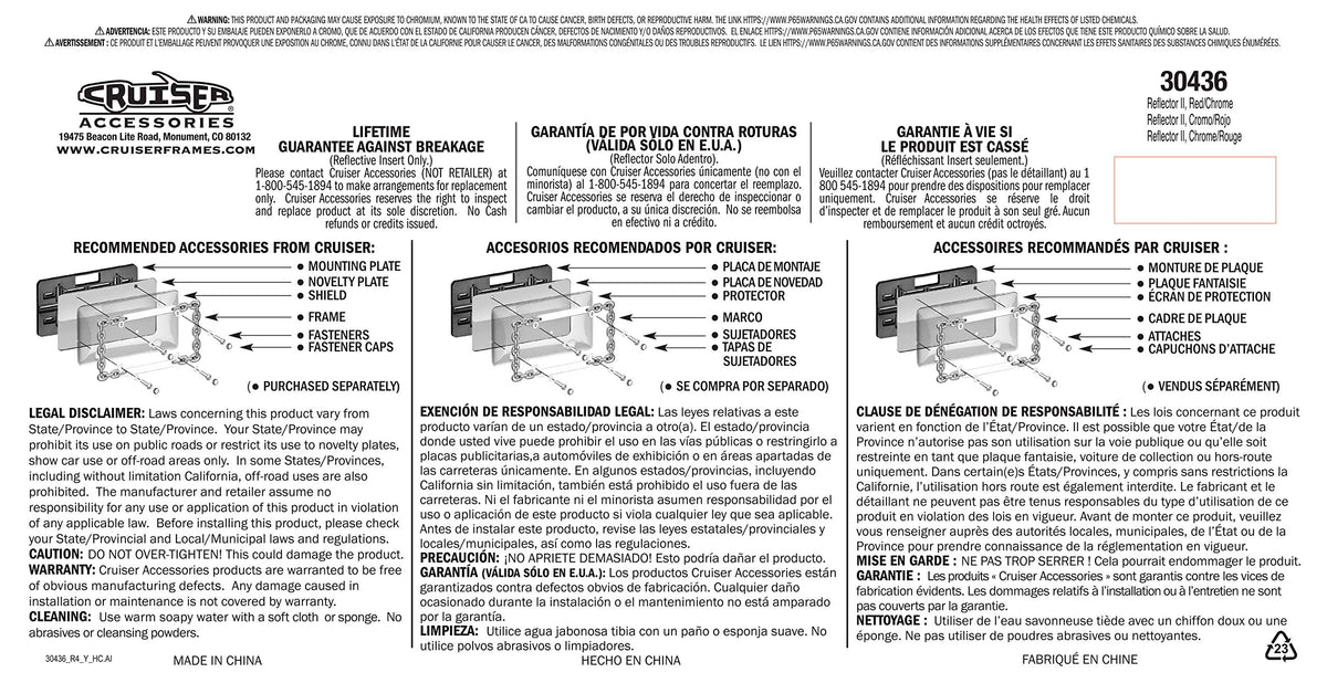 Reflect Your Style With The Red Reflector Frame Made From Official Sae Dot Certified Reflective Material. Cruiser Accessories Is A Family Owned Business That Has Been Manufacturing And Selling License Plate Frames For Over 30 Years. Through Innovation, Attention To Detail And Many Patented Designs, Cruiser Has Evolved Into The Largest Supplier Of License Plate Frames, Novelty Plate Shields And Mounting Hardware In The Automotive Aftermarket. Cruiser'S Product Line Also Includes Both Standard And Exclusive Star Pin Locking Hardware, Designer Fastener Caps, Mounting Accessories, Motorcycle Frames And 3D-Cals Decals. Let Cruiser Accessories Complete Your Ride’S Look Today!