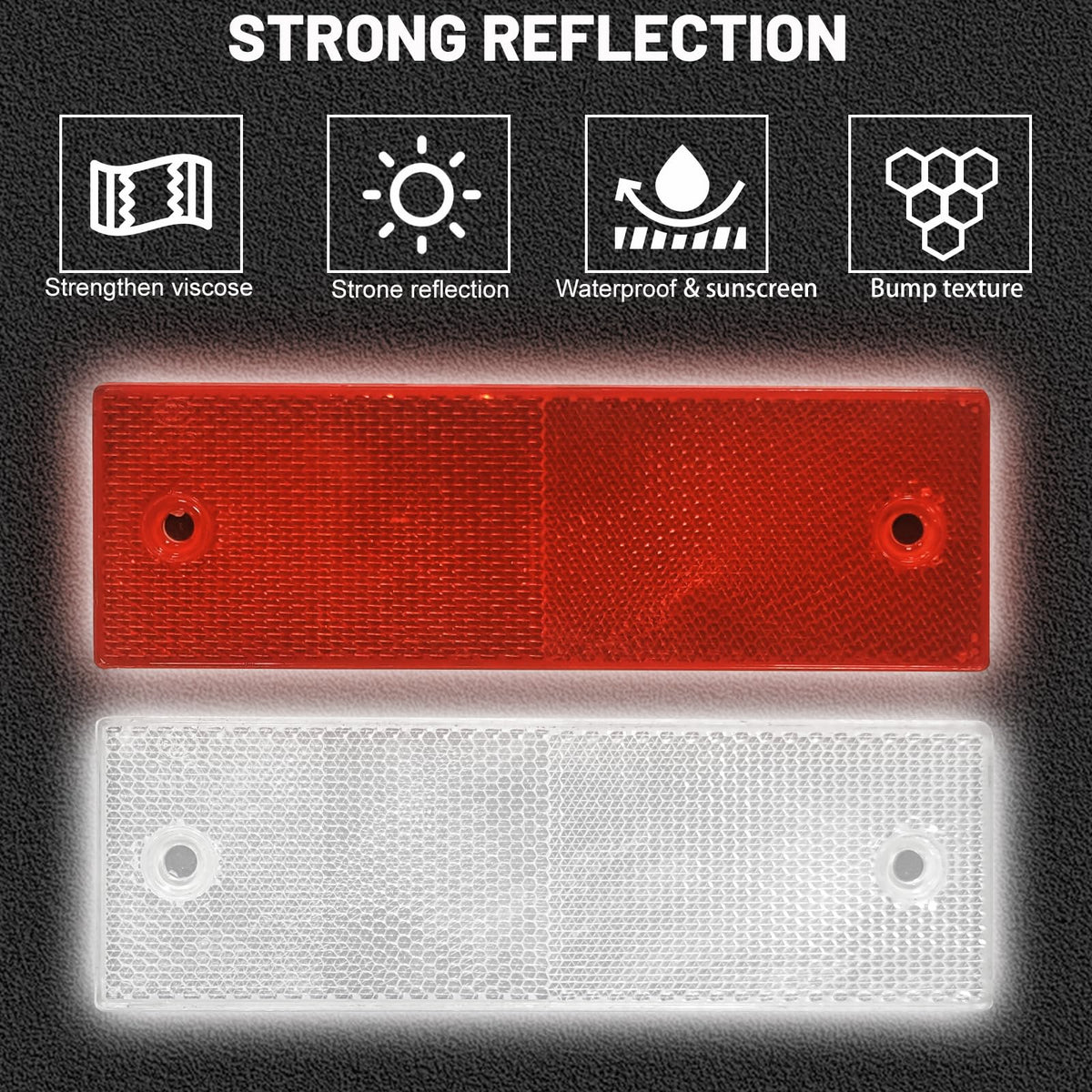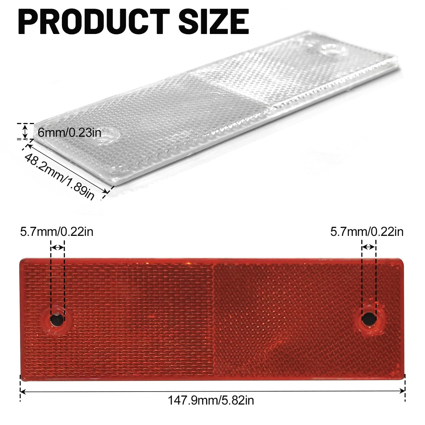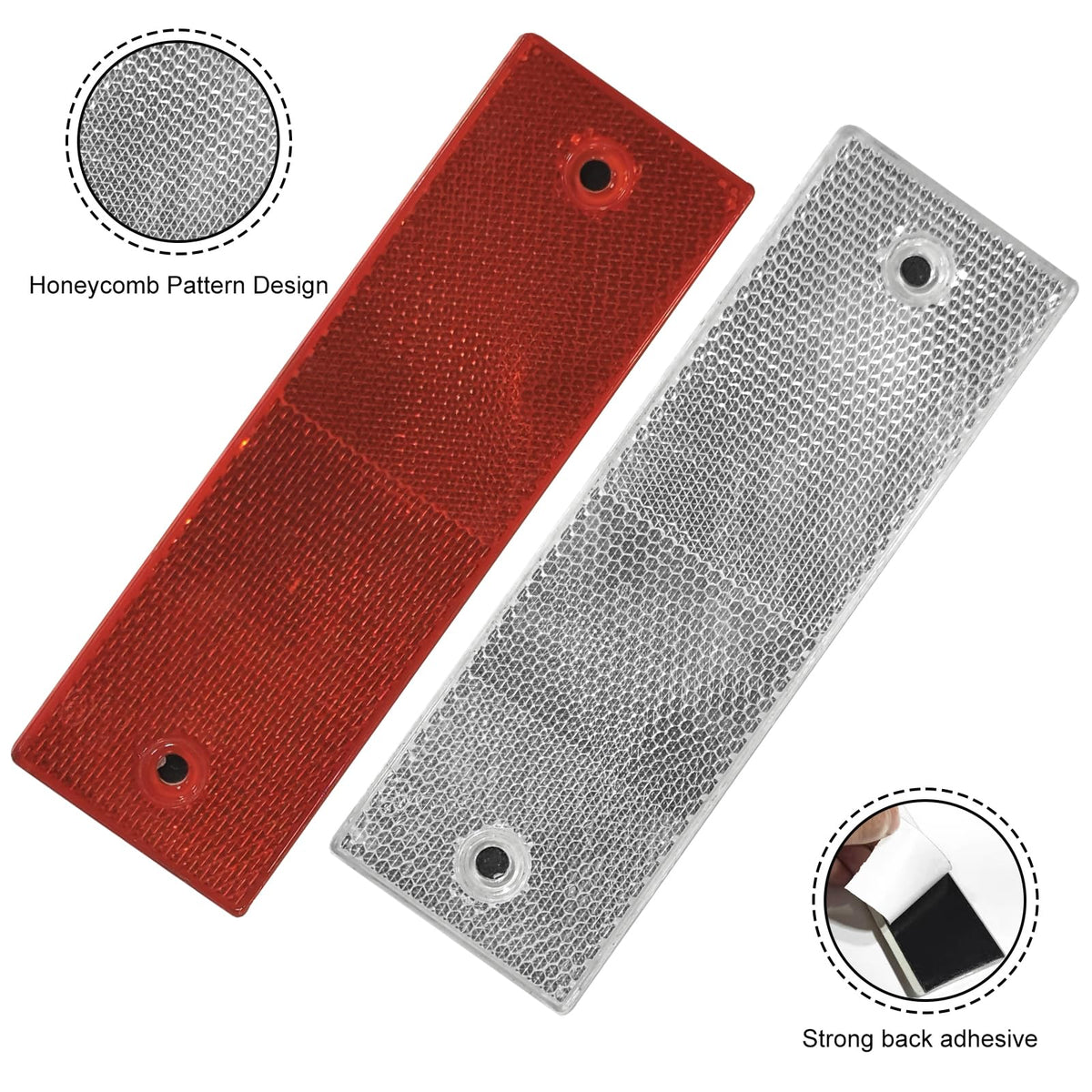 Specifications Width: 1.7Inch Length:5.7Inch Color: Red & White Material: Honeycomb Pattern Design (High-Quality Abs Plastic) Package Included: 8 Red And 8White Reflective Tape