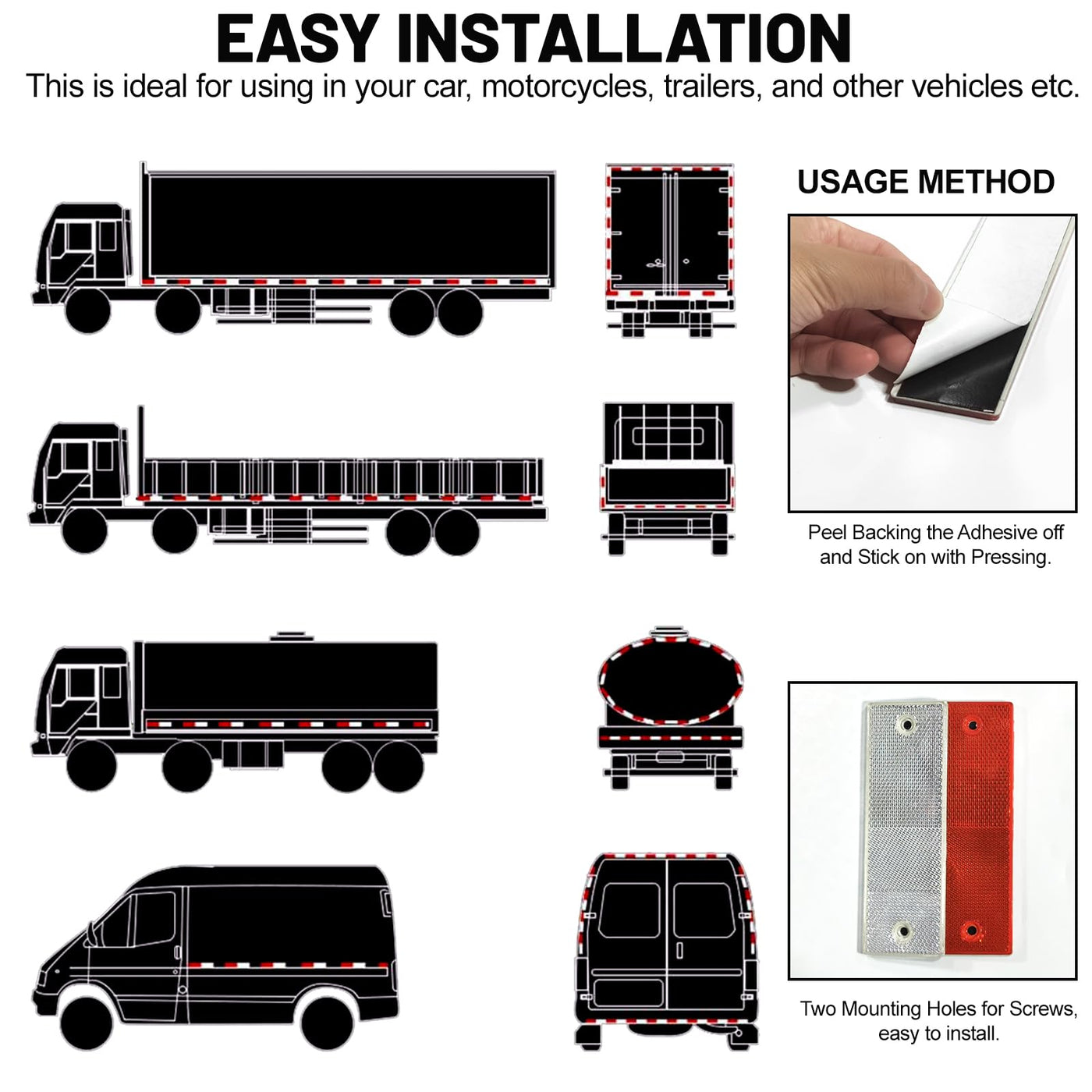 Instructions For Use Easy To Install, No Tools Needed. Our Reflective Tape Are Super Easy To Install For Indoors And Outdoors And Will Adhere To Any Clean And Smooth Surface. Step 1: Wipe Your Car Body,Do Not Have Dust Or Rust, Which Will Affect The Adhesive Effect And Service Life. Step 2: Carefully Tear The Peeling Layer Slowly. Step 3:Put The Reflective Sticker In The Place Where The Plan Is Planned. Step 4: Apply Pressure Evenly To Make It Stick Firmly.