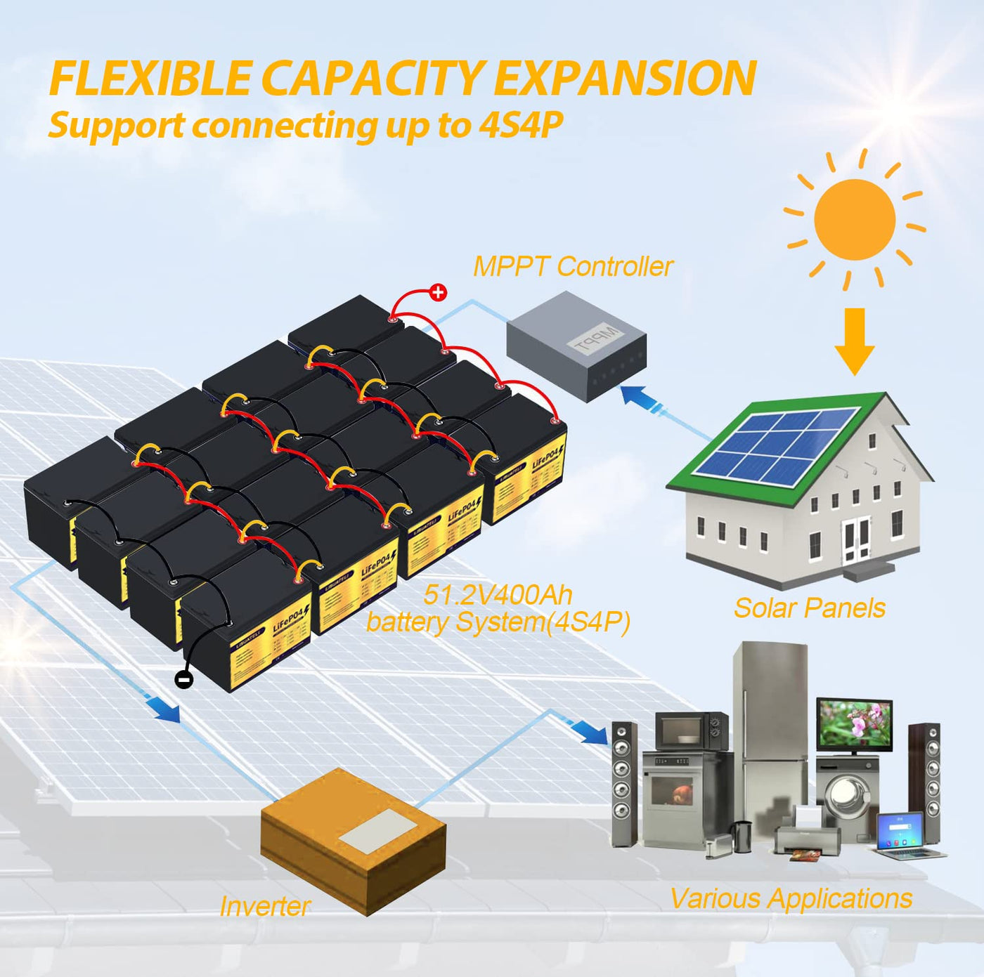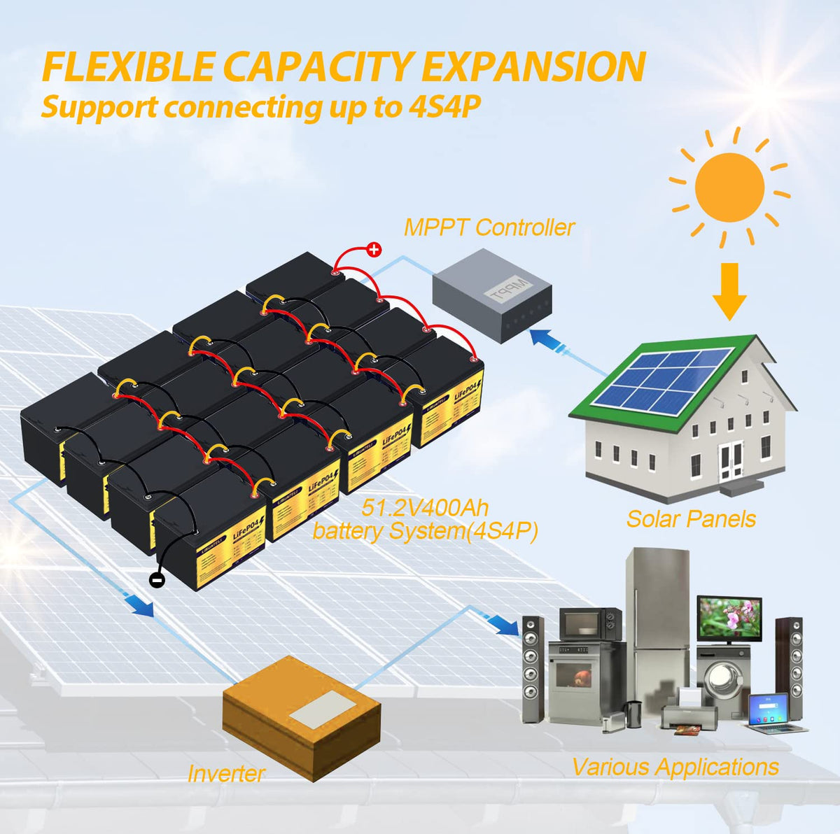 Q: Can I connect multiple 12V 100Ah batteries in series or parallel?A: Yes, you can connect up to four 12V 100Ah LiFePO4 batteries in series or in parallel, allowing for increased voltage or capacity based on your energy needs. However, ensure that the connections are properly made for optimal performance.