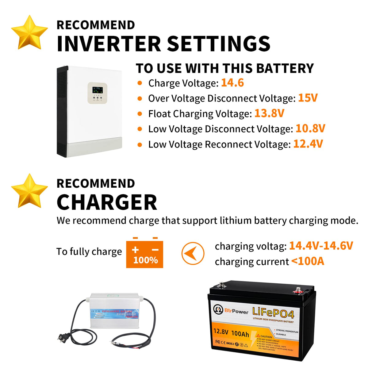 Why do people always choose lithium iron phosphate batteries? Super Safe Battery: Our 12v battery is made of automotive LiFePo4 battery, which has higher energy density, more stable performance and more power. Do not explode or catch fire. Built-in 100A BMS: support 100A charge and discharge, with overcharge, overdischarge, overcurrent, short circuit, overtemperature protection. Durable: Over 10 years of service life, 3 times longer than lead acid (only 3 years)Allow DIY: can be connected in series and parallel. ??12V 100Ah LiFePO4 battery specification Rated capacity: 100Ah / 1280Wh Rated voltage: 12.8V Maximum protection voltage: 14.6V End voltage: 10V Terminal: M8 Operating temperature: charge 0C50C, discharge -20C60C, store -20C50C Impedance: 15mO Size: 12.8L*6.7W*8.5H (inch) ?? Expansion Maximum Series Connection: Up to 4 identical cells connected in series up to 48V (51.2V). Parallel connection: Multiple batteries can be connected, and it is recommended that no more than 4 batteries be connected in parallel. The 4 batteries connected must be of the same brand, of the same capacity, and purchased within 6 months. Safety Precautions Do not put the battery into water or get wet Keep the battery away from heat sources It is forbidden to trample the battery with a hammer Do not disassemble the battery in any way Tips: If you like to install a battery monitor, please pay attention to distinguish the fully charged voltage of the battery in different states. Due to the floating voltage nature of lifepo4, the fully charged voltage in the charging state: 14.2V14.6V, and the fully charged voltage in the state of not connecting the charger: 13.3V13.8V.