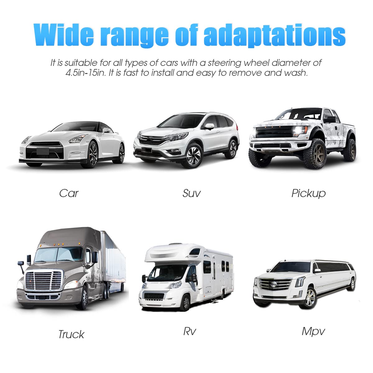 Q: What sizes of steering wheels does this cover fit?A: This steering wheel cover is designed to fit most medium-sized steering wheels with a diameter of 14.5 inches to 15 inches, making it suitable for a wide range of vehicles including cars, SUVs, vans, and trucks.