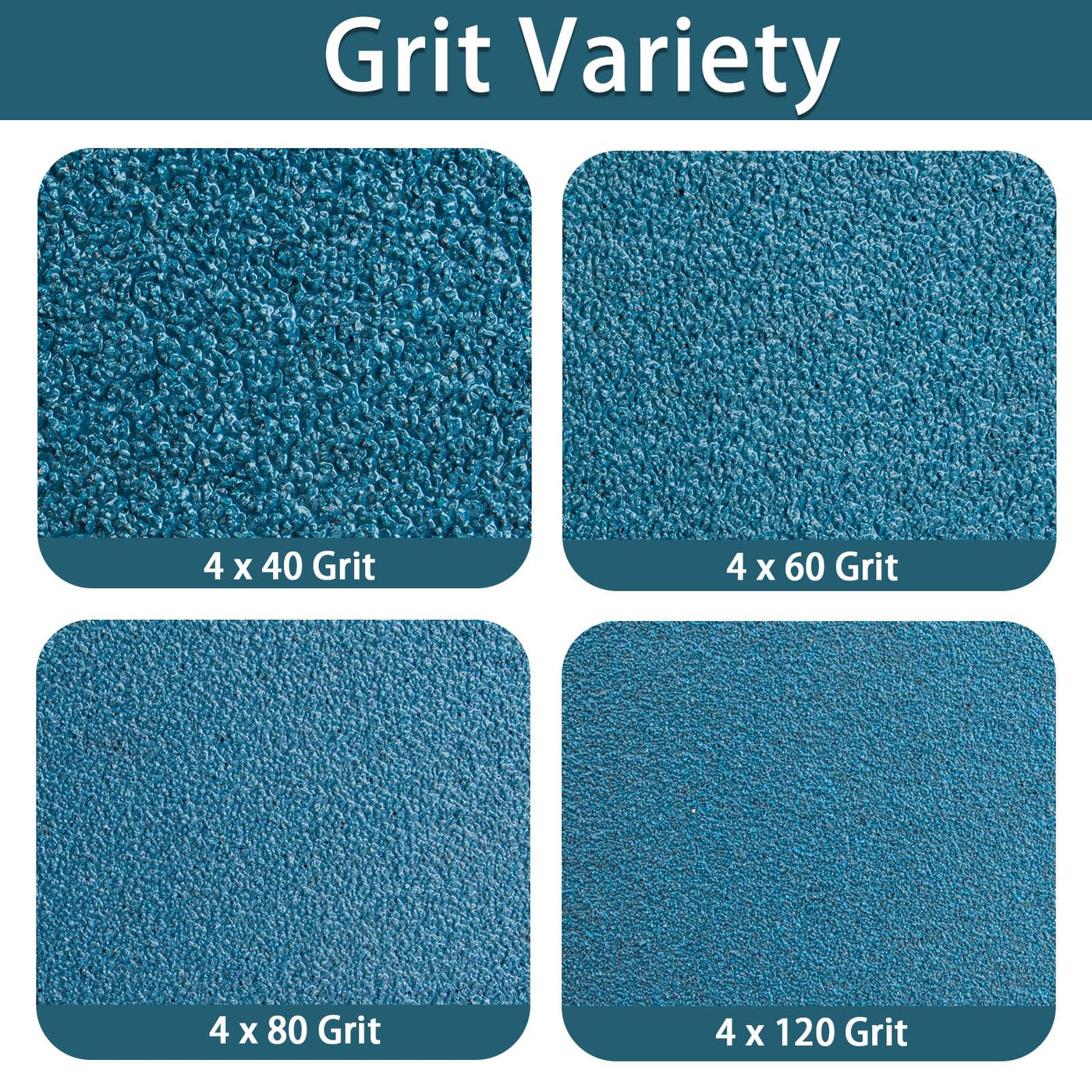 Q: What grit sizes are included in the 4x36 inch sanding belts kit?A: The 4x36 inch sanding belts kit includes a total of 16 pieces with four different grit sizes: 4 pieces of 40 grit, 4 pieces of 60 grit, 4 pieces of 80 grit, and 4 pieces of 120 grit. This variety allows you to choose the right grit for your specific sanding needs.