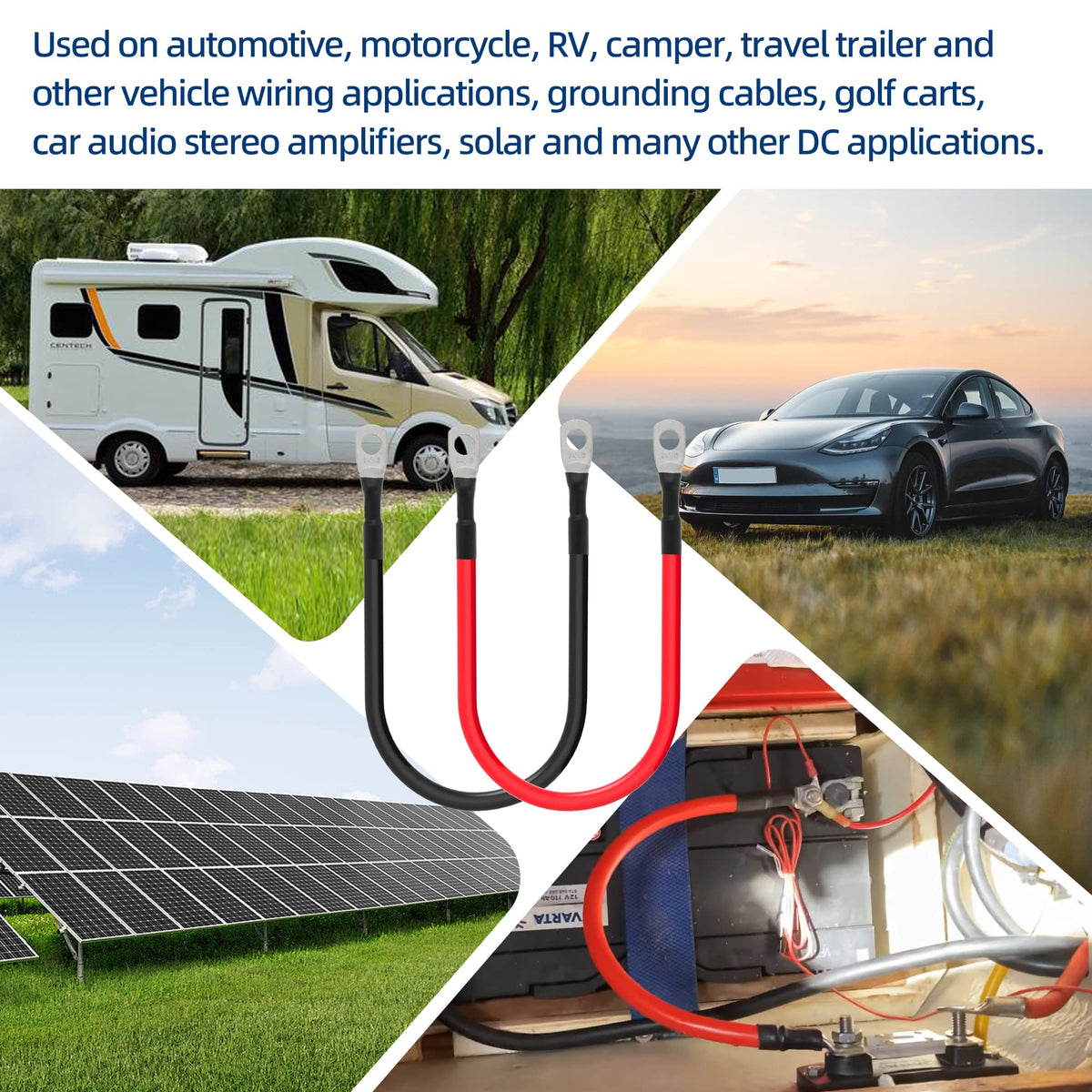 Q: What vehicles can I use these 6 AWG battery cables with?A: These 6 AWG battery cables are designed for a wide range of vehicles and applications, including automotive, solar setups, marine vessels, boats, RVs, cars, and motorcycles.