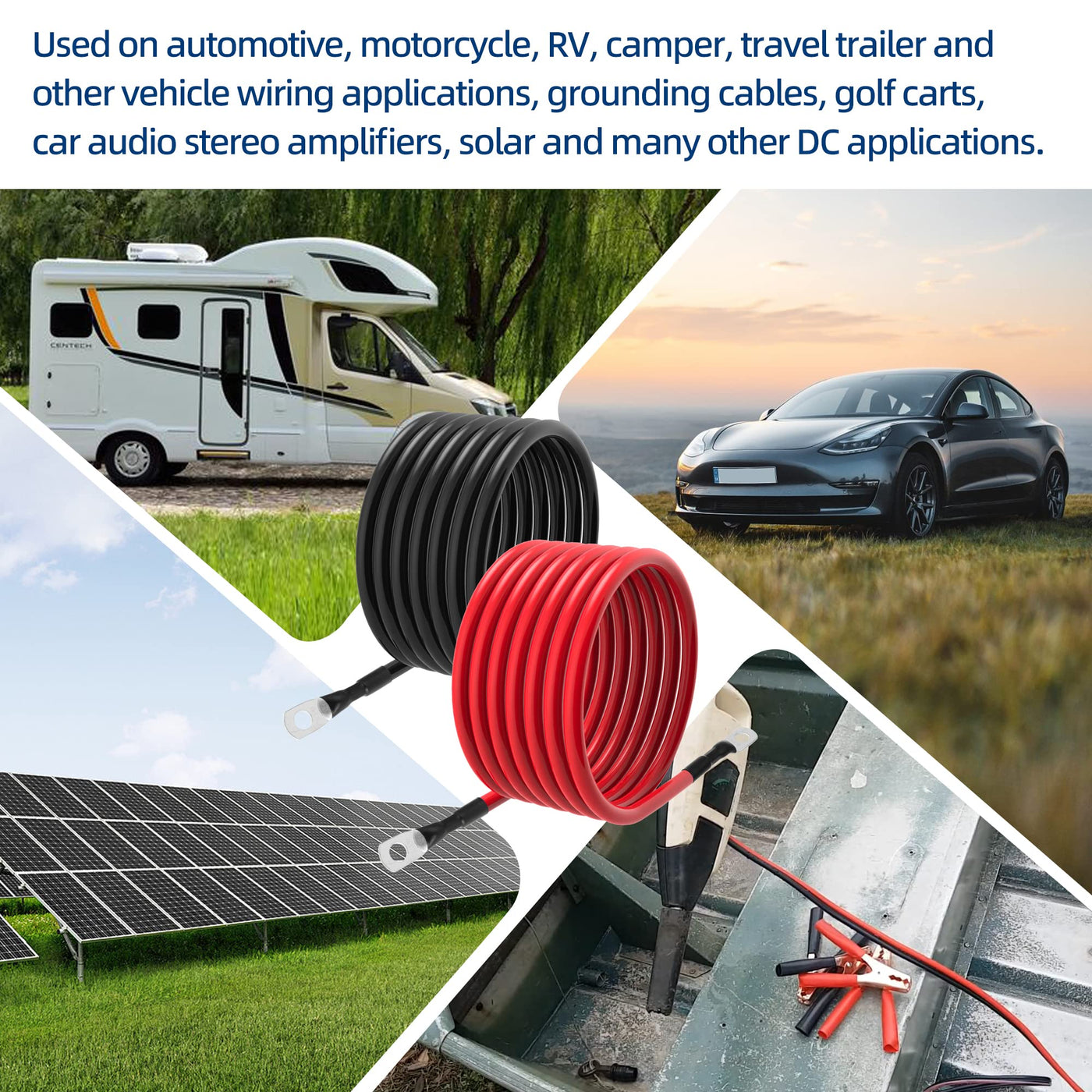 Q: What applications are suitable for the 6 AWG battery cables?A: The 6 AWG battery cables are designed for various applications including automotive, solar systems, marine environments, boats, RVs, cars, and motorcycles. Their versatility makes them a reliable choice for connecting power sources in these settings.