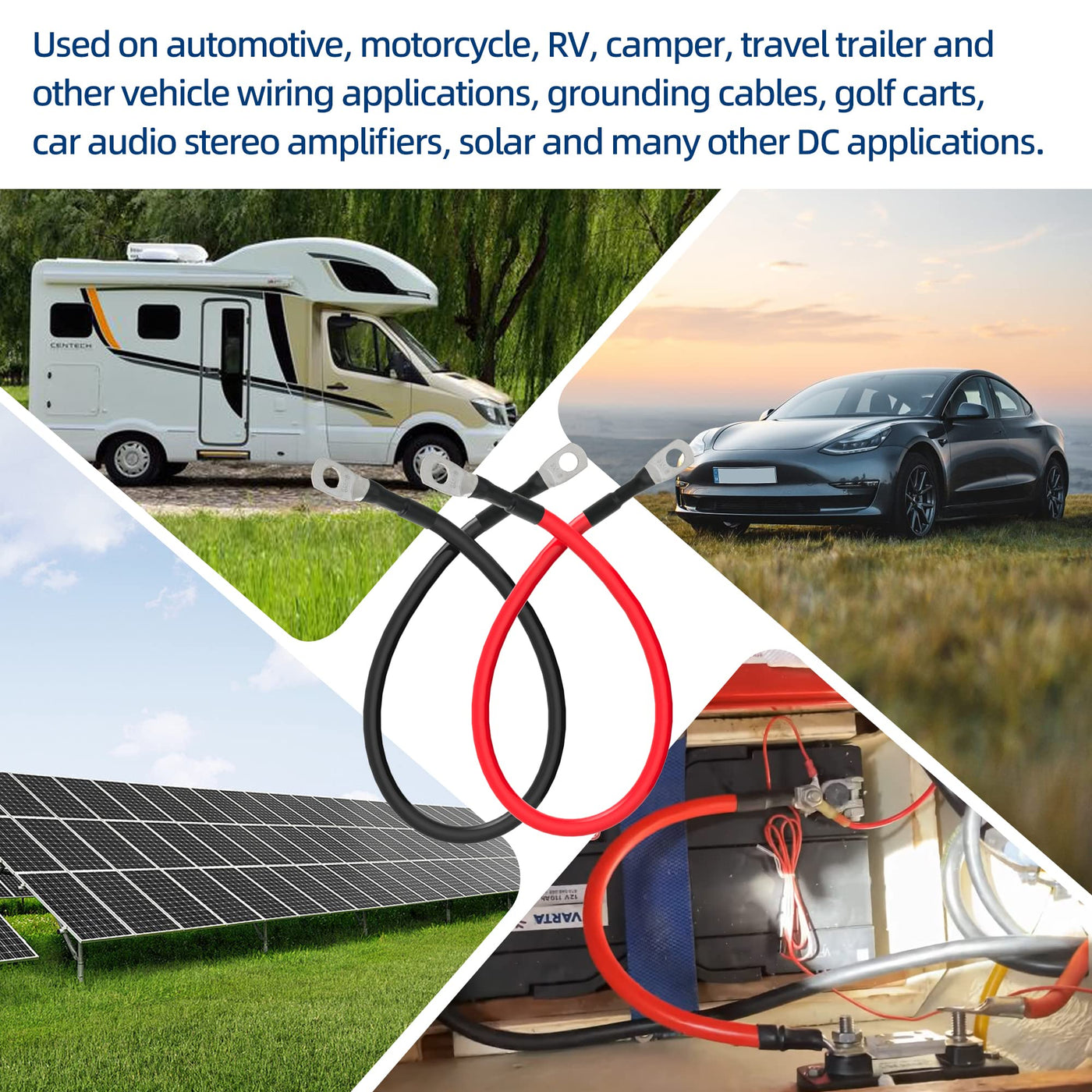 Q: What type of terminals do the cables have and how do they improve performance?A: Each cable is equipped with two 5/16 inch tinned copper ring terminals, which help prevent corrosion and allow for easier soldering, ensuring a reliable and durable connection.