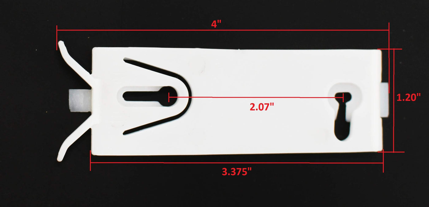 Q: What are the dimensions of the molding retainer clip?A: The molding retainer clip measures approximately 4 inches in total length, with a width of 1.20 inches and a distance of 2.07 inches between slots.