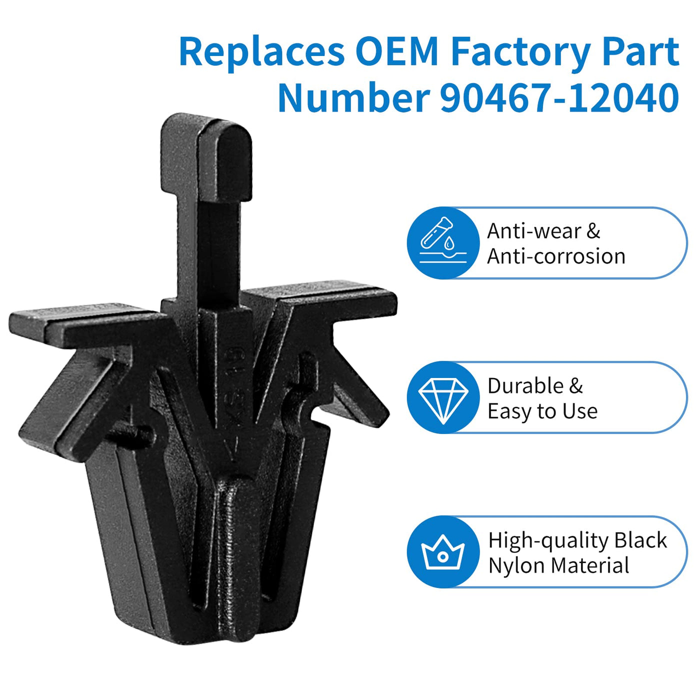 Q: Can these clips replace OEM part numbers, and if so, which ones?A: Yes, these grille clips replace OEM factory part numbers 90467-12040 and 9046712040, making them a reliable replacement option.