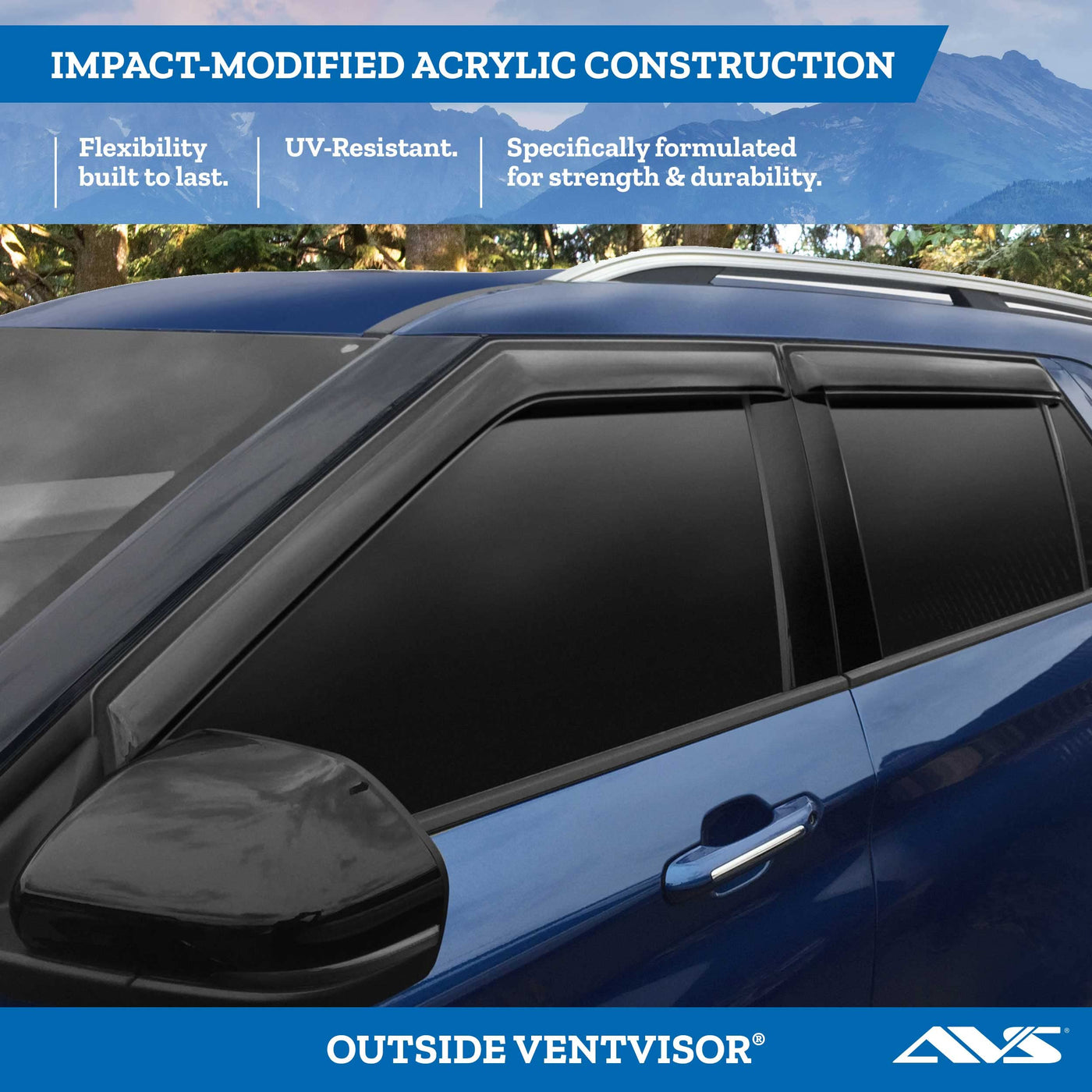 Q: What materials are used in the construction of the AVS rain guards?A: The AVS Outside Mount Rain Guards are made from high-grade impact-resistant acrylic that is scratch resistant and will not fade or discolor from sun exposure, ensuring long-lasting durability.
