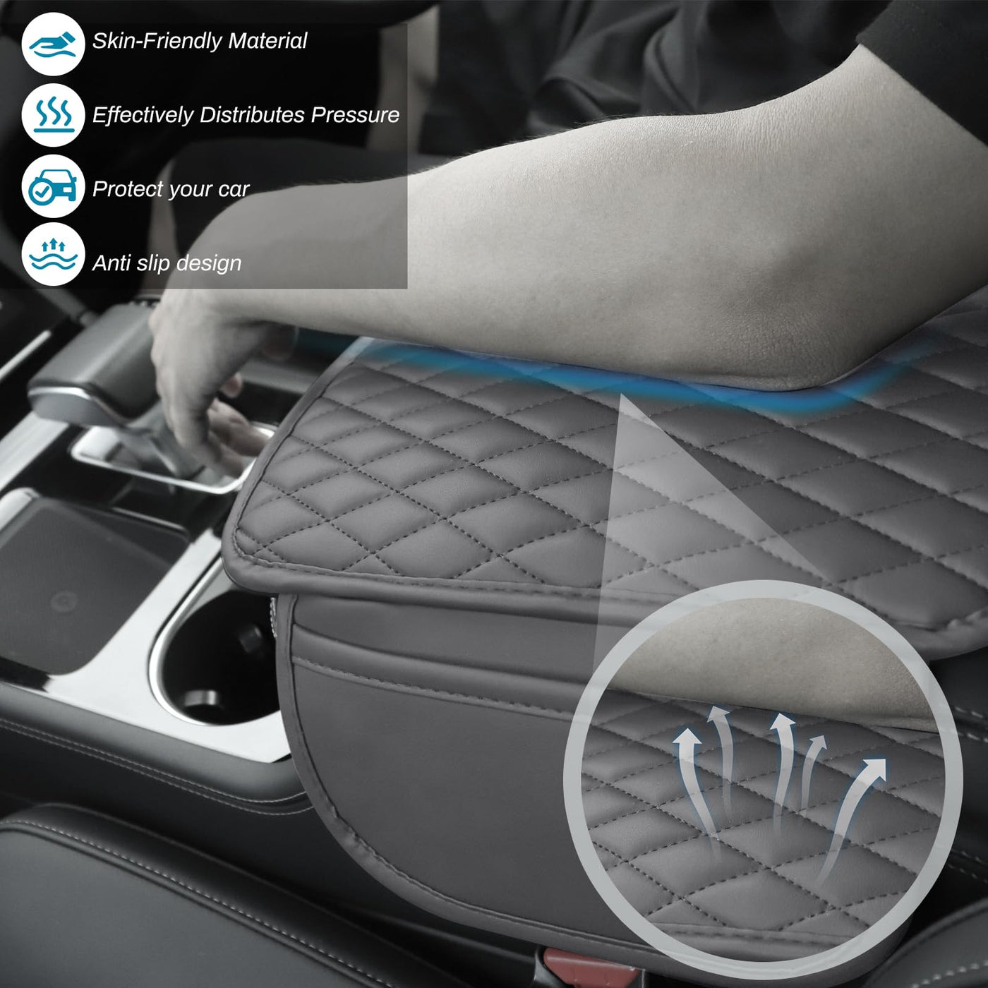 Q: How does the microfiber leather enhance comfort?A: The cover is made from premium microfiber leather, providing a soft, skin-friendly touch along with a thick memory foam interior that supports your arm and relieves pressure during long drives.