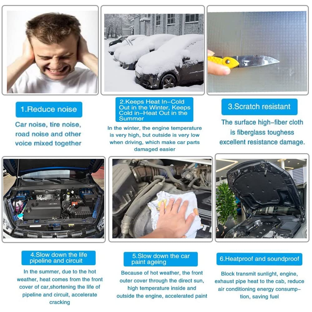 Features: Our sound dampener liner is composed of closed foam sponge, covered with mesh aluminum foil on the surface, waterproof, oil resistant and high temperature resistantSound dampening mat has excellent sound insulation and vibration absorption performance, reduces external noise, creates a comfortable driving environment suitable for doors, roofs, floors, hoods, firewalls, chassis, luggage, trunk lids, etc. Specification:Material: Aluminum fiber, Sound-absorbing cottonSize: 40 x 60 inch 315 inch(1 1.5m)Thickness: 394mil, Total Coverage area: 16.36 sqftworking Temperature Range: -40F ~ 300F. Package Included:1 Pc x Car Engine Mat