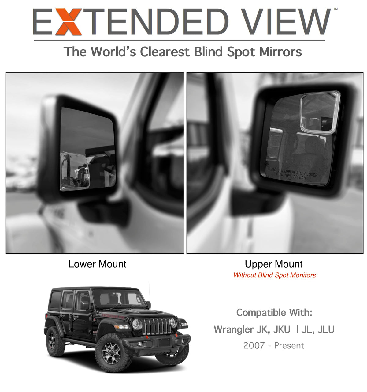 Custom designed to fit on the top or bottom of the factory mirrors. Top fitment is only for models WITHOUT blind spot monitoring. JK and JL Wranglers are impressive machines with one major shortcoming, the small factory mirrors. NXTGEN Extended View blind spot mirrors are custom made for your vehicle, and compatible with 2007- present, Jeep Wrangler with or without blind spot monitoring. The contour, curvature and viewing angle are all customized to work with your factory specific mirror glass. Our Extended View mirrors are engineered on 9 planes to provide the clearest, most distortion free convex mirrors in the world and are made of the absolute finest materials, including: polished polycarbonate bases, OEM grade glass and genuine 3M adhesive.Extended View blind spot mirrors are a useful driving aid for: - Lane changes - Merging into traffic and onto freeways - Towing - Off-Roading - Seeing bikes, motorcycles and pedestrians - Emergency maneuvers - Non-distorted visibility of the blind spots around your vehicle - Parallel parking - Maneuvering into or around tight spaces - And more!