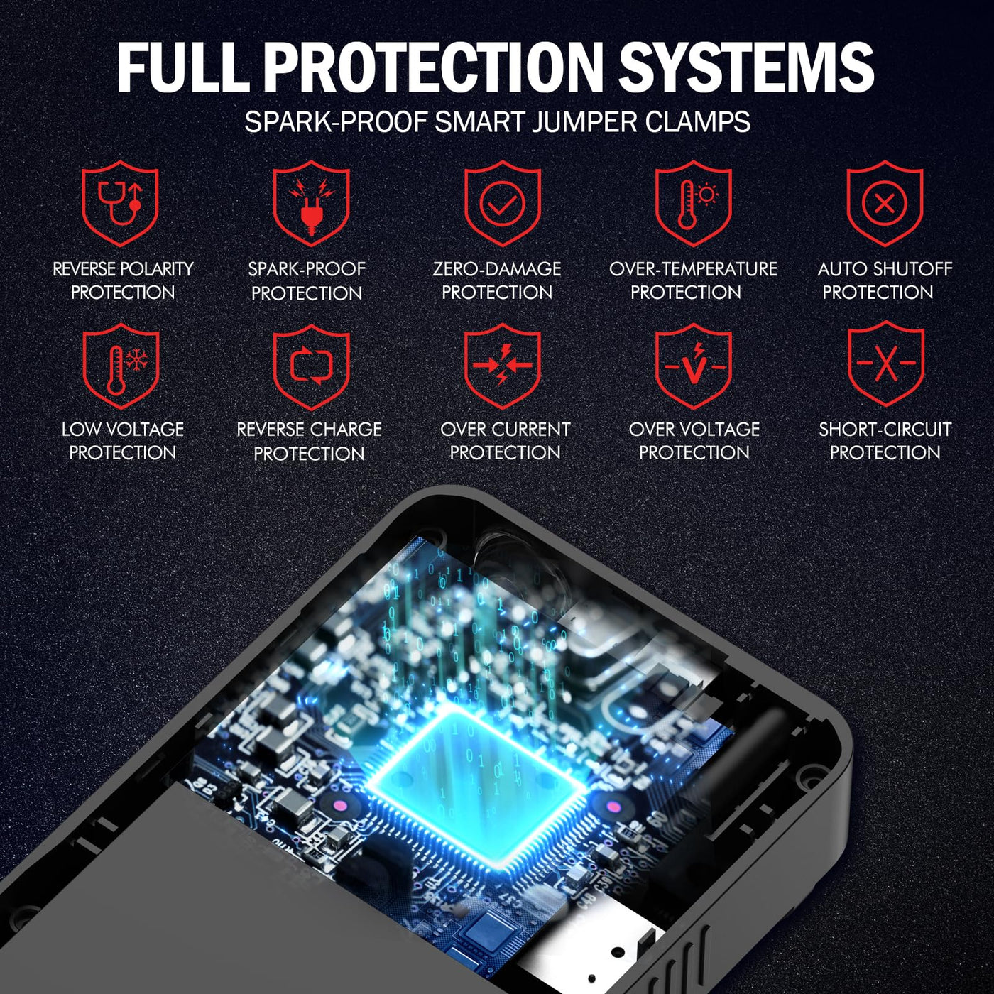 Q: Is the DBPOWER G60 jump starter safe to use?A: Absolutely! The DBPOWER G60 jump starter is designed with a safety protection system that includes safeguards against low/high voltage, over-temperature, short-circuit, and reverse polarity. Its all-metal clamps ensure durability and safety during use.