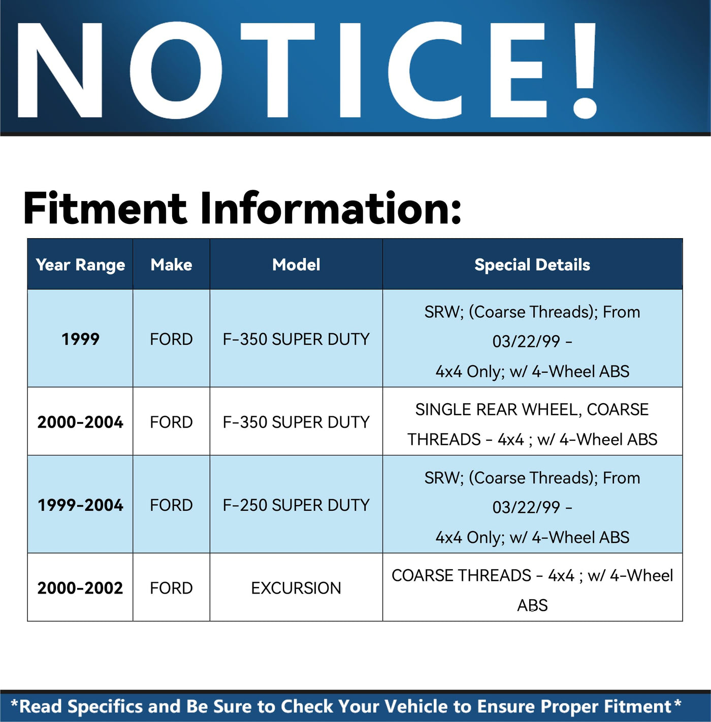 Kit Includes: 2x Front Wheel Bearing and Hubs Assembly - 515020 Hub Specification: Position: Front Lugs: 8 Bolt Drive Type: 4WD ABS Type: Sensor Wire Flange: 4-Bolt Square Fitment: **With ABS - 4x4 ONLY - Single Rear Wheel - Coarse Thread** **If you need Fine Thread please check the ASIN: B00HHGSS4A** Replacement for 1999 Ford F-350 Super Duty (SRW; Coarse Threads; Built After 03/22/99; 4x4 Only; w/4 Wheel ABS) Replacement for 2000-2004 Ford F-350 Super Duty (SRW; Coarse Threads; 4x4 Only; w/4 Wheel ABS) Replacement for 1999-2004 Ford F-250 Super Duty (SRW; Coarse Threads; Built After 03/22/99; 4x4 Only; w/4 Wheel ABS) Replacement for 2000-2002 Ford Excursion (SRW; Coarse Threads; 4x4 Only; w/4 Wheel ABS) Introduction: Detroit Axle is a leading global retailer and distributor of OE re-manufactured and new aftermarket auto parts. We are committed to providing first-class products and outstanding customer service at an incredible value. Our rapidly-expanding product line includes CV Axles, Wheel Hub & Bearings, Suspension & Chassis parts, Complete Strut Assemblies, Shock Absorbers, Drilled & Slotted Brake Rotors, Conventional Brake Rotors, Ceramic Brake Pads, Rack & Pinion Assemblies, Gearboxes, Drive Shafts, and more. With over 30 years experience, we are proud that millions of customers around the world rely on Detroit Axle parts. We have two Metro Detroit storefront locations on the north and west sides of the city.