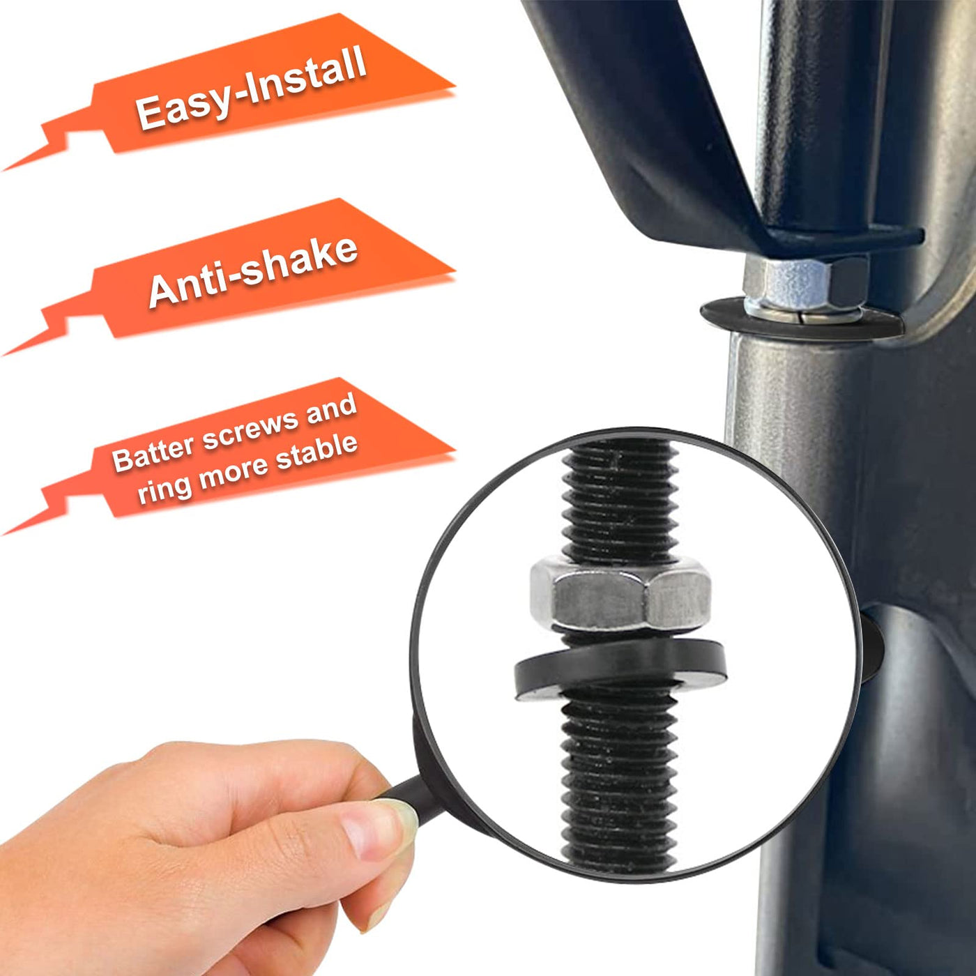 Q: How does this mirror reduce wind noise while driving?A: The mirror's streamlined design helps minimize wind noise, and it features fixed rods on both sides that create a stable triangular structure, reducing shaking and bending while driving.