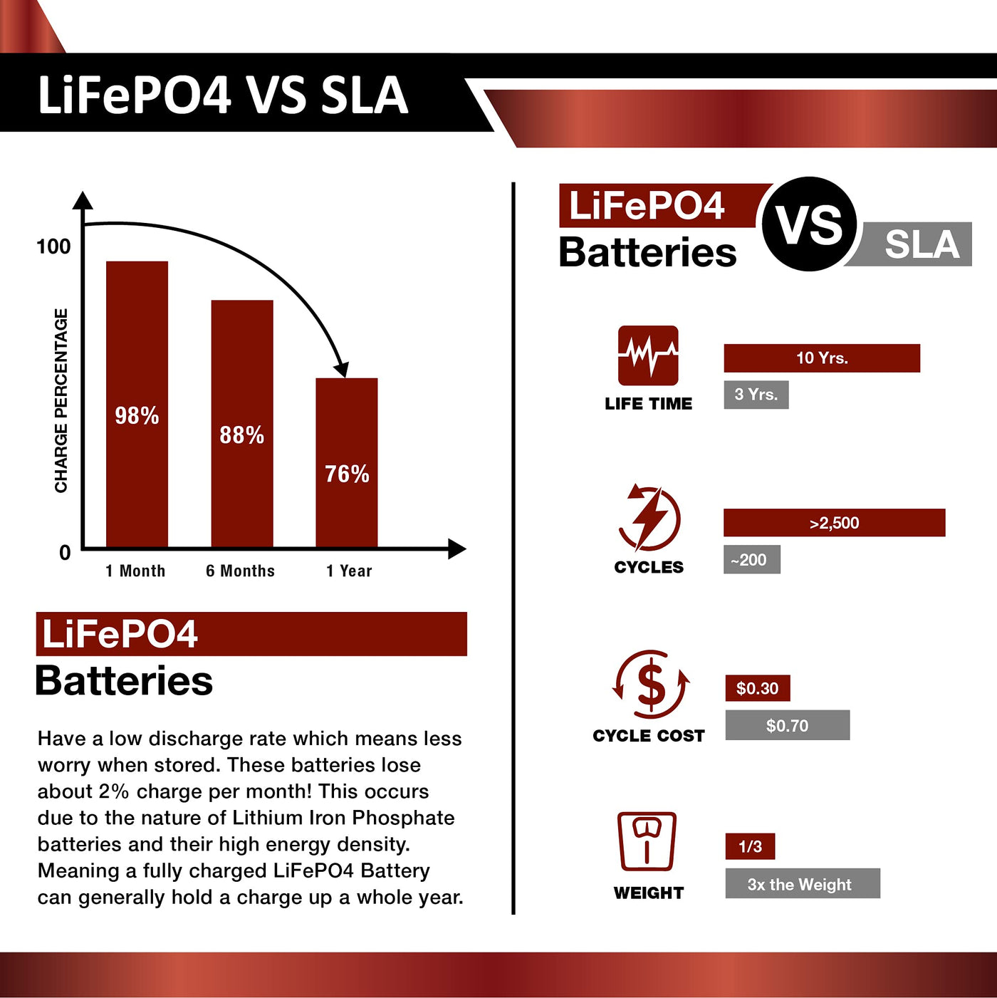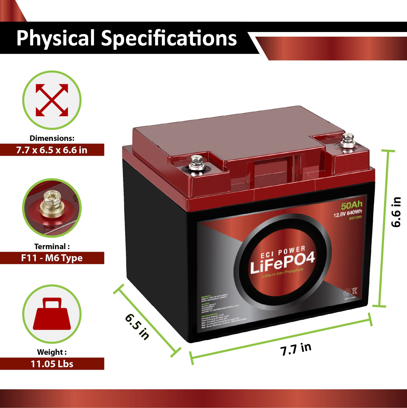 Eci Power: A Brand For Everyone With The Goal Of Providing An Open Avenue For All To Know That Safe Lithium Power Should Not Be Cost-Prohibitive Nor Outside The Scope Of Your Project. | Unmatched Technology: The Eci Power Lifepo4 Battery Is Designed To Meet The Needs Of Modern Energy Applications While Exceeding Performance Comparable To Even The Most Expensive Batteries On The Market. | Proven Quality: The Battery Utilizes Ul1642 Listed Lifepo4 Grade-A Cells And Is Backed By Our Industry-Leading Engineering And After-Sale Teams Covering North America And Beyond Since 1987. | Economical: At A Phenomenal Price Point, The Battery Is Rigorously Lab-Tested And Guaranteed To Meet A Minimum 2000 Cycles At 80% Dod, Providing High-Performance Longevity With A Maximum Of 5000 Cycles At 50% Dod. | Complete Protection: The Lithium Battery’S Unique Built-In Battery Management System (Bms) Protects It From Overcharge, Deep Discharge, Overloading, Overheating And Short Circuit, And Excessive Low Self-Discharge Rate Ensuring Up To 1 Year Maintenance-Free Storage. Built-In Low-Temp Cut Off Prevents Charging Under 23 °F (-5 °C).
