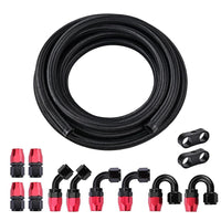 Q: What is included in the package of the fuel line kit?A: The package includes 10 pieces of 8AN black and red swivel hose ends (4 straight, 2 at 45 degrees, 2 at 90 degrees, and 2 at 180 degrees), 2 hose separator clamps, and a 20-foot braided fuel line.