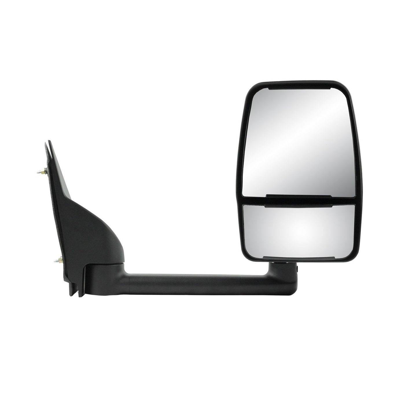 Passenger Side Mirror for Chevrolet Express Van/ GMC Savana Full Size Van, towing Mirror. Textured black with paintable cover. Dual lens. Foldaway. Manual. Mirror glass adjusted manually. Convex Lens. Mirror glass does not have heating capabilities. Manual folding for additional clearance. Mirror has no turn signal. Housing finish is Textured Black, PTM Cover.