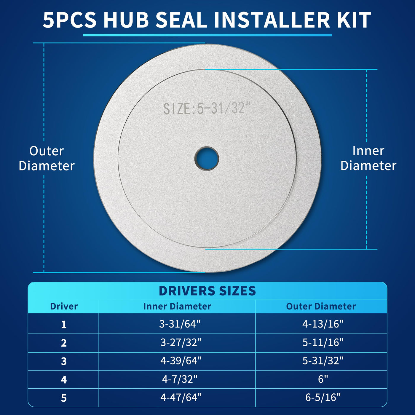 Q: What sizes of seal drivers are included in the kit?A: The kit includes five different sizes of seal drivers: 4-3/16", 6-5/18", 5-31/32", 5-11/16", and 6", allowing for versatile use in various applications.