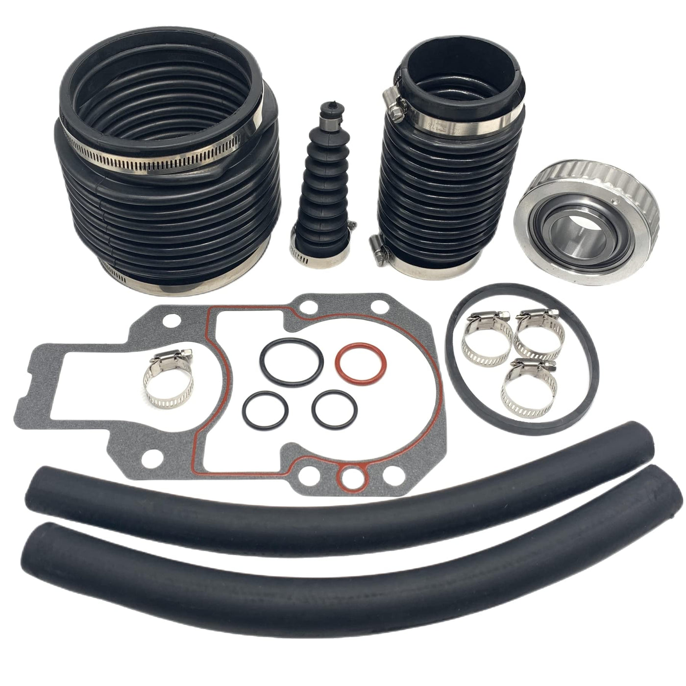 Q: What is included in the GHmarine 803097T1 Bellows Kit?A: The GHmarine 803097T1 Bellows Kit includes a complete set of components to replace all rubber parts and the gimbal bearing in the gimbal housing on the transom. Specifically, it comes with a 'U' joint bellows assembly, exhaust bellows, water hoses (both 5/8" & 3/4"), shift bellows, all necessary stainless steel clamps, a gimbal bearing, and a gasket kit.