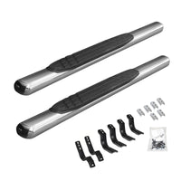 Q: What materials are used in the construction of the Go Rhino side steps?A: The Go Rhino side steps are constructed from durable stainless steel, featuring a polished finish and welded end caps, which not only enhance their aesthetic appeal but also ensure longevity and resistance to corrosion.